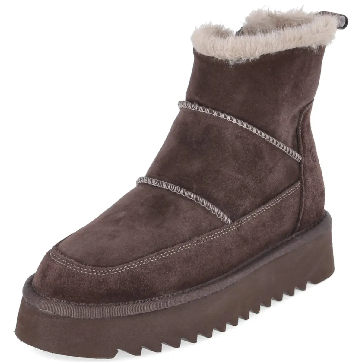 Der Tamaris Winterboot präsentiert sich in warmem Braun mit rustikalem Charakter: robustes Echtleder in Rauleder-Optik, grobe Nähte und ein verstärkter Fußrahmen verleihen Stabilität und Stil. Das weiche Teddyfutter mit Kunstfellkrempe umschließt angenehm und hält an kalten Tagen zuverlässig warm. Für Leichtigkeit sorgt das geringe Gewicht, während das gepolsterte Fußbett und die textile Decksohle den Komfort über Stunden sichern. Die runde Spitze, der 3,5‑cm‑Plateauabsatz und der praktische Reißverschlusseinstieg mit Anziehlasche runden das Profil ab. Fällt normal aus und eignet sich für erwachsene Damen, die einen funktionalen Begleiter mit femininem Touch suchen. Ein Modetipp: Zu Skinny-Jeans, Wollmantel und grobem Strickschal entsteht ein lässig-urbaner Look; eine Ton-in-Ton-Lederhandtasche betont das natürliche Braun harmonisch.