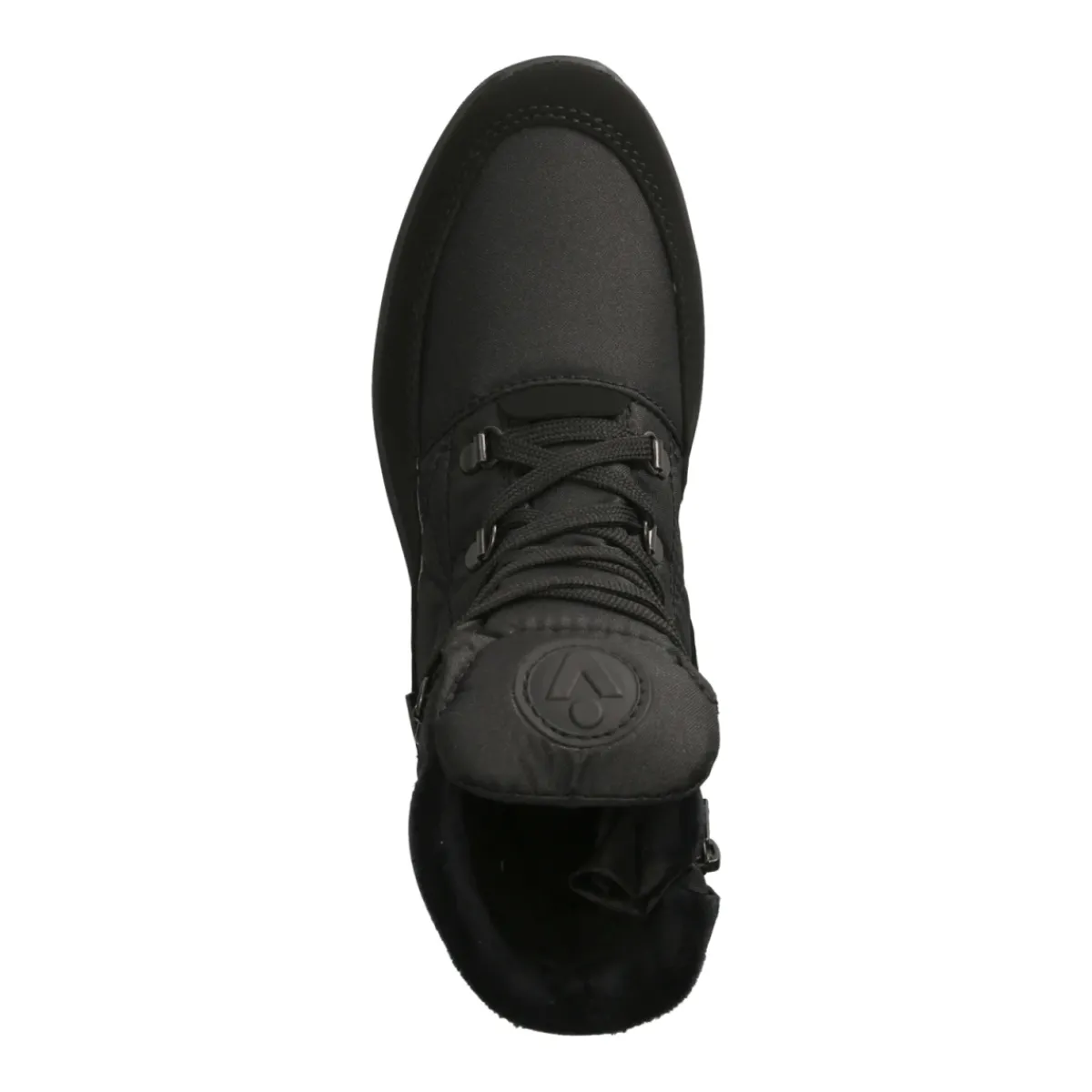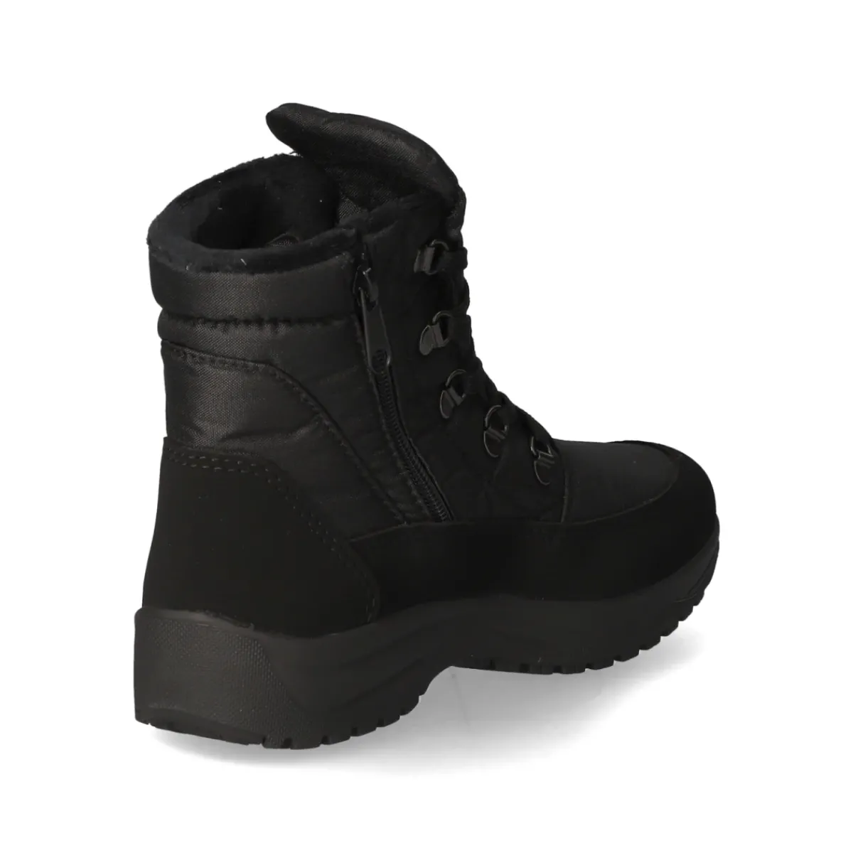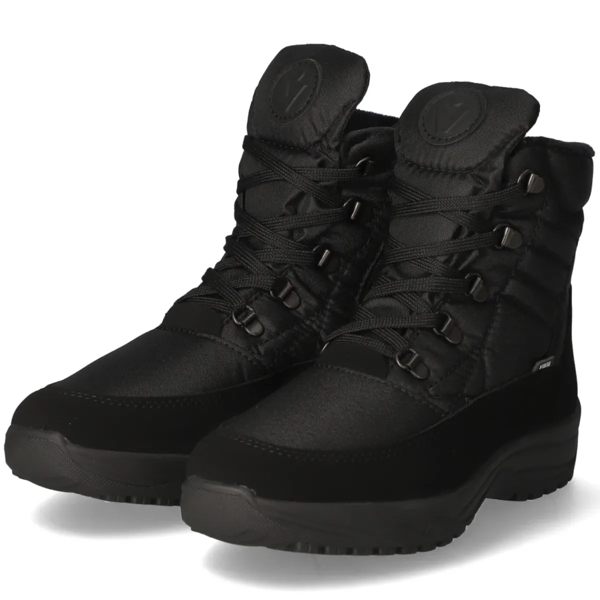 Die Winterstiefeletten von Vista in klassischem Schwarz kombinieren wetterfesten Schutz mit hohem Komfort. Das robuste Obermaterial aus Textil und die wasserabweisende, atmungsaktive Ausstattung sichern ein angenehmes Fußklima, während das weiche Warmfutter zuverlässig wärmt. Schnürung und Reißverschlusseinstieg sorgen zusammen für passgenauen Halt und schnellen Einstieg. Die runde Schuhspitze schenkt Zehenfreiheit, der gepolsterte Schaft entlastet den Knöchel. Für maximale Trittsicherheit auf Eis und Schnee steht die flexible OC-System-Profilsohle mit ausklappbaren Spikes bereit; rutschhemmend bei Glätte und komfortabel im Alltag. Die gepolsterte, herausnehmbare Wechseldecksohle bietet weiche Dämpfung und lässt sich bei Bedarf gegen eigene Einlagen tauschen. Modetipp: Zu einer verkürzten Wollhose und einer voluminösen Steppjacke entsteht ein cleaner, sportiver Winterlook.