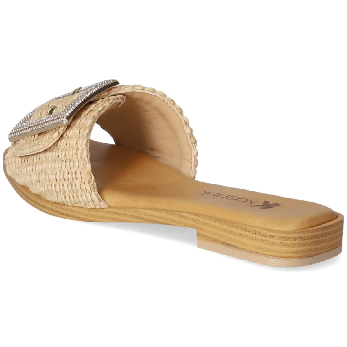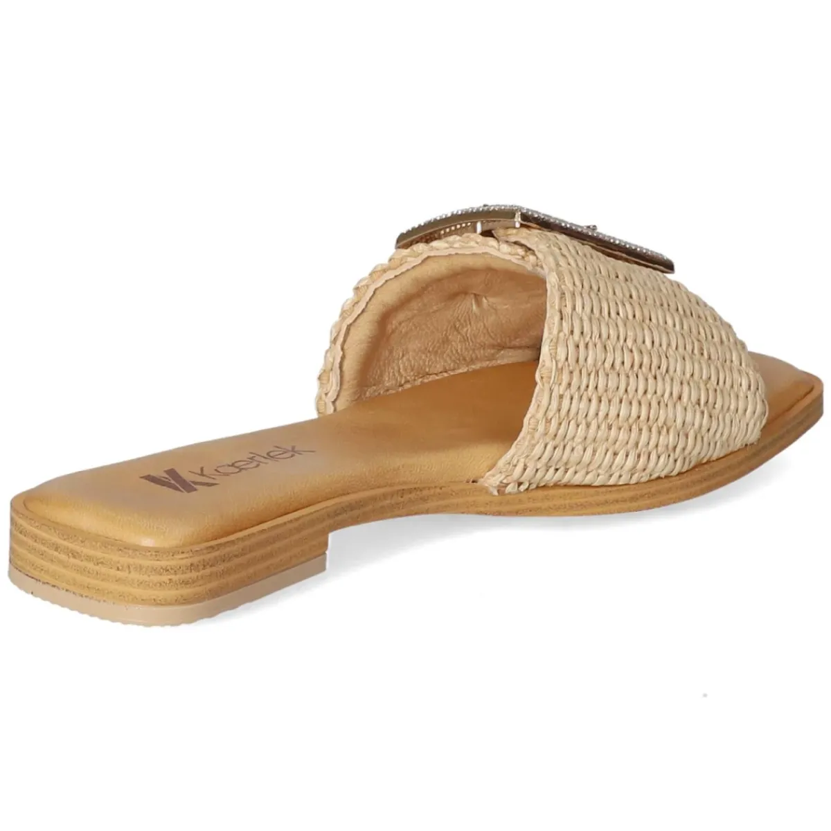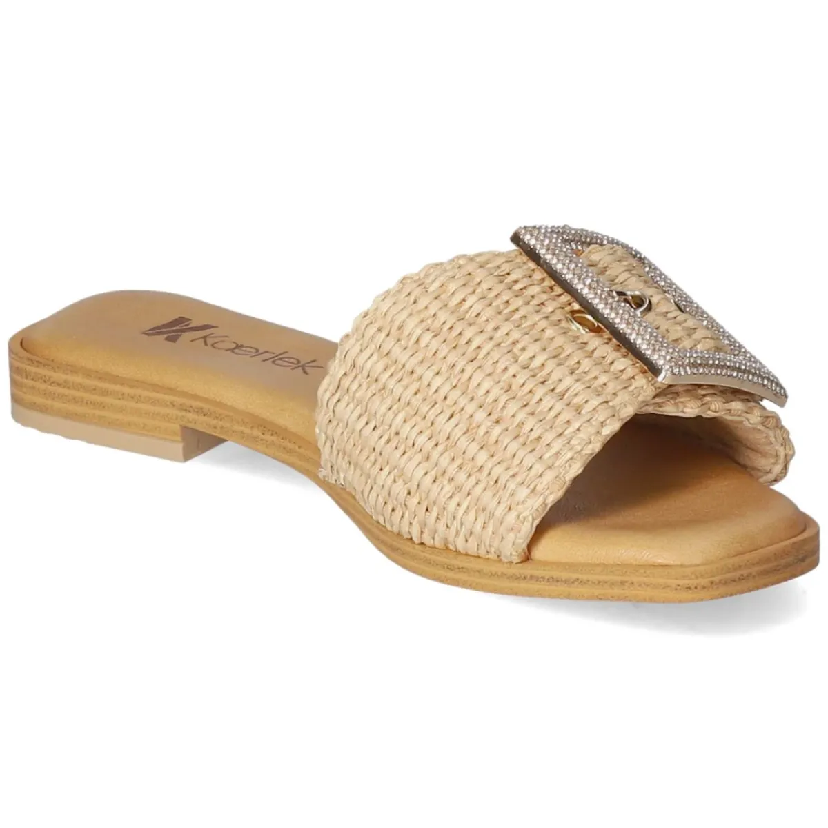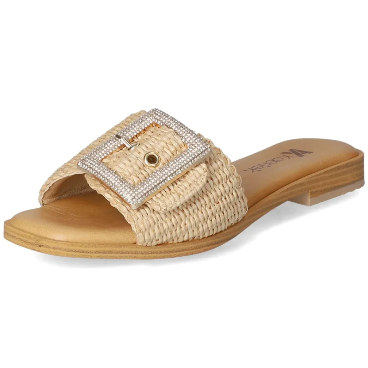 Mit den Pantoletten NATURALE von Kaerlek zieht ein sommerlicher Klassiker in die Garderobe ein. Das beige Modell spielt mit einem luftigen Material-Mix und einer geflochtenen Sisaloptik, die Leichtigkeit und Struktur verleiht. Eine offene Schuhspitze sorgt für angenehme Belüftung, während die Decksohle aus Leder den Fuß weich umschließt. Die goldfarbene Schnalle mit funkelnden Schmucksteinen setzt einen eleganten Akzent und erlaubt zugleich ein individuelles Anpassen. Dank flexibler, griffiger Laufsohle bleibt der Auftritt trittsicher – ob Stadtbummel oder Strandpromenade. Das Modell fällt normal aus und bietet durch das synthetische Obermaterial pflegeleichte Alltagstauglichkeit. Modetipp: Zur weiten Leinenhose und einem cremefarbenen Stricktop kombinieren, dazu eine Korbtasche – so entsteht ein harmonischer Ton-in-Ton-Look mit subtiler Glamour-Note.