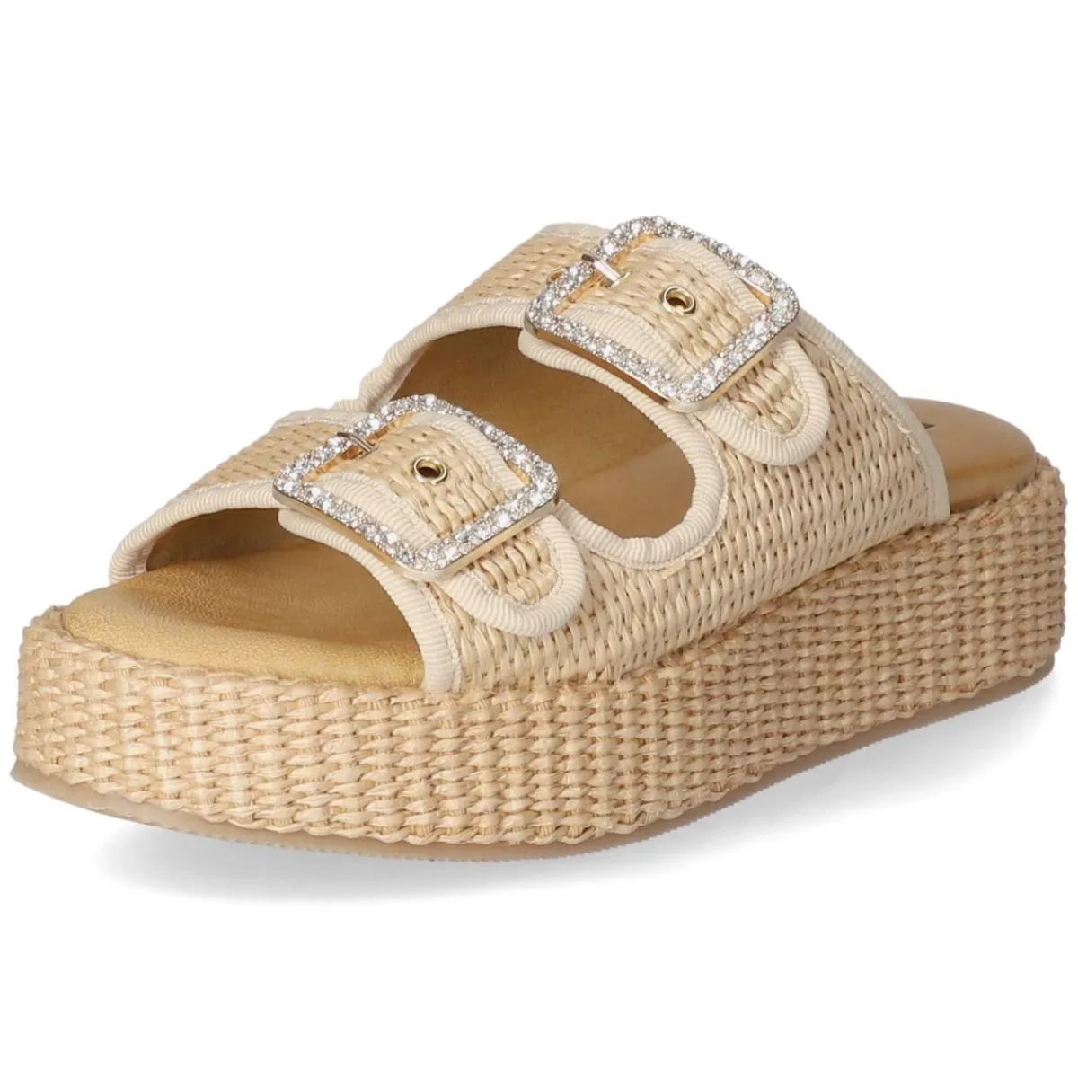 Die Pantoletten NATURALE von Kaerlek verbinden sommerliche Leichtigkeit mit modernem Design. Das beige Obermaterial aus hochwertig modern designter Synthetik zeigt eine feine Sisaloptik, die zusammen mit dem 4,5 cm hohen Plateau eine natürliche Textur und angenehme Höhe bringt. Die offene Schuhspitze unterstreicht den luftig-freien Charakter, während zwei goldfarbene Schnallen mit glitzernden Schmucksteinen einen eleganten Akzent setzen. Dank sicherer Schnallen lässt sich die Weite individuell anpassen, das gepolsterte Fußbett und die Decksohle aus Leder sorgen für dauerhaften Tragekomfort. Die Passform fällt normal aus und begleitet mühelos durch Alltag und Stadtbummel. Modetipp: zu fließenden Leinenkleidern oder Culottes und einer Basttasche kombinieren – die neutrale Beige-Nuance und die Sisaloptik harmonieren perfekt mit natürlichen Materialien.