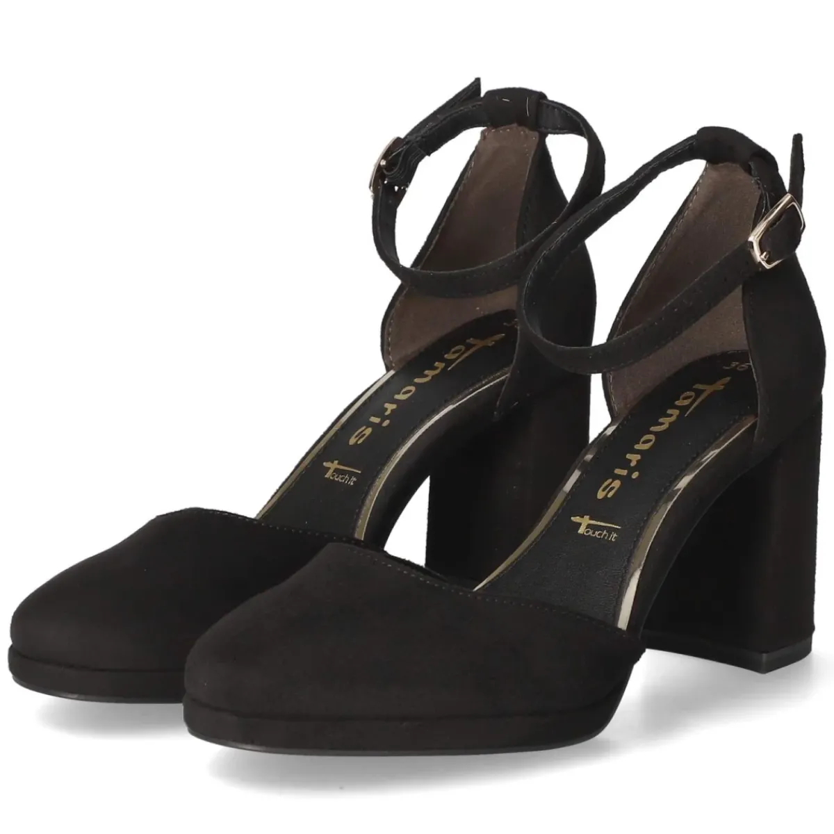 Der Tamaris Pumps in klassischem Schwarz verleiht jedem Look eine elegante Note. Sein 8 cm hoher Blockabsatz sorgt für souveräne Höhe und dank der stabilen Form für angenehmen Stand. Das Obermaterial aus hochwertigem Synthetik zeigt eine samtige Oberfläche, die von dezenten, goldenen Akzenten edel gerahmt wird. Die runde Schuhspitze wirkt zeitlos feminin, während die verstellbare Schnalle mit integriertem Elastikeinsatz sicheren Halt und ein komfortables Einsteigen ermöglicht. Eine weich gepolsterte Decksohle aus Textil und die rutschfeste Laufsohle unterstützen Komfort und Trittsicherheit im Alltag und am Abend. Das Modell fällt normal aus und ist vollständig aus veganen Materialien gefertigt – stilbewusste Wahl ohne Kompromisse. Modetipp: Zu einem fließenden Midikleid oder einem Tailoring-Ensemble in Creme entfaltet der Pumps seine klassische Stärke; filigraner Goldschmuck greift die Metall-Details harmonisch auf.