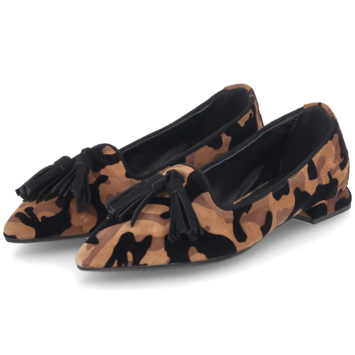 Diese Damen-Ballerinas von Kaerlek interpretieren den Klassiker mit urbaner Lässigkeit: Braunes Camouflage auf softem Rauleder trifft auf eine spitze Silhouette, die den Fuß optisch streckt. Quasten über dem Zehenbereich setzen einen verspielten Akzent, während der flache Blockabsatz Stabilität verleiht. Die Lederdecksohle und ein leicht gepolsterter Fersenbereich sorgen für angenehmen Komfort, unterstützt vom relaxten Leichtgewicht-Charakter und der flexiblen, griffigen Laufsohle. Die Schlupfform ohne Verschluss macht das Anziehen unkompliziert, die Passform fällt normal aus und begleitet souverän Büro- wie Wochenend-Looks. Modetipp: Besonders stimmig zu monochromen Sand- und Beigetönen mit feinen Goldaccessoires; starke Kontraste entstehen mit schwarzer Zigarettenhose und strukturiertem Blazer.