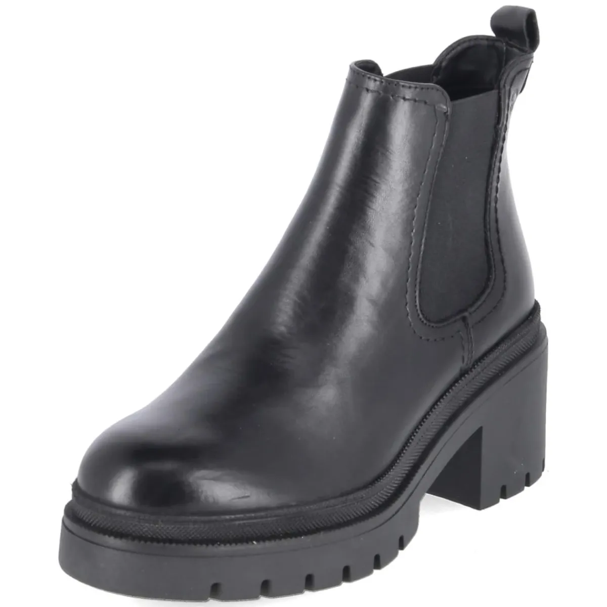 Der Chelsea Boot von Tamaris setzt auf eine moderne, klare Linie und vereint Komfort mit stilvoller Präsenz. Schwarzes Glattleder aus langlebigem Echtleder formt eine edle Optik, die runde Schuhspitze und die zwei großen, seitlichen Elastikeinsätze sorgen für den typischen Chelsea-Charakter. Dank Anziehlasche gelingt der Einstieg mühelos, der Verzicht auf einen Verschluss hält das Design pur. Ein gepolstertes Fußbett sowie die Decksohle aus Textil und Synthetik bieten ein angenehmes Tragegefühl im Alltag, während die rutschfeste Profilsohle sicheren Halt verleiht. Der 7,5 cm hohe Blockabsatz streckt die Silhouette, bleibt aber stabil und alltagstauglich. Das Modell fällt normal aus und richtet sich an erwachsene Damen, die eine moderne Optik mit Funktionalität verbinden möchten. Modetipp: Zu knöchellanger Straight-Jeans und Oversize-Blazer entsteht ein urbaner Look, der sowohl im Büro als auch am Abend überzeugt.