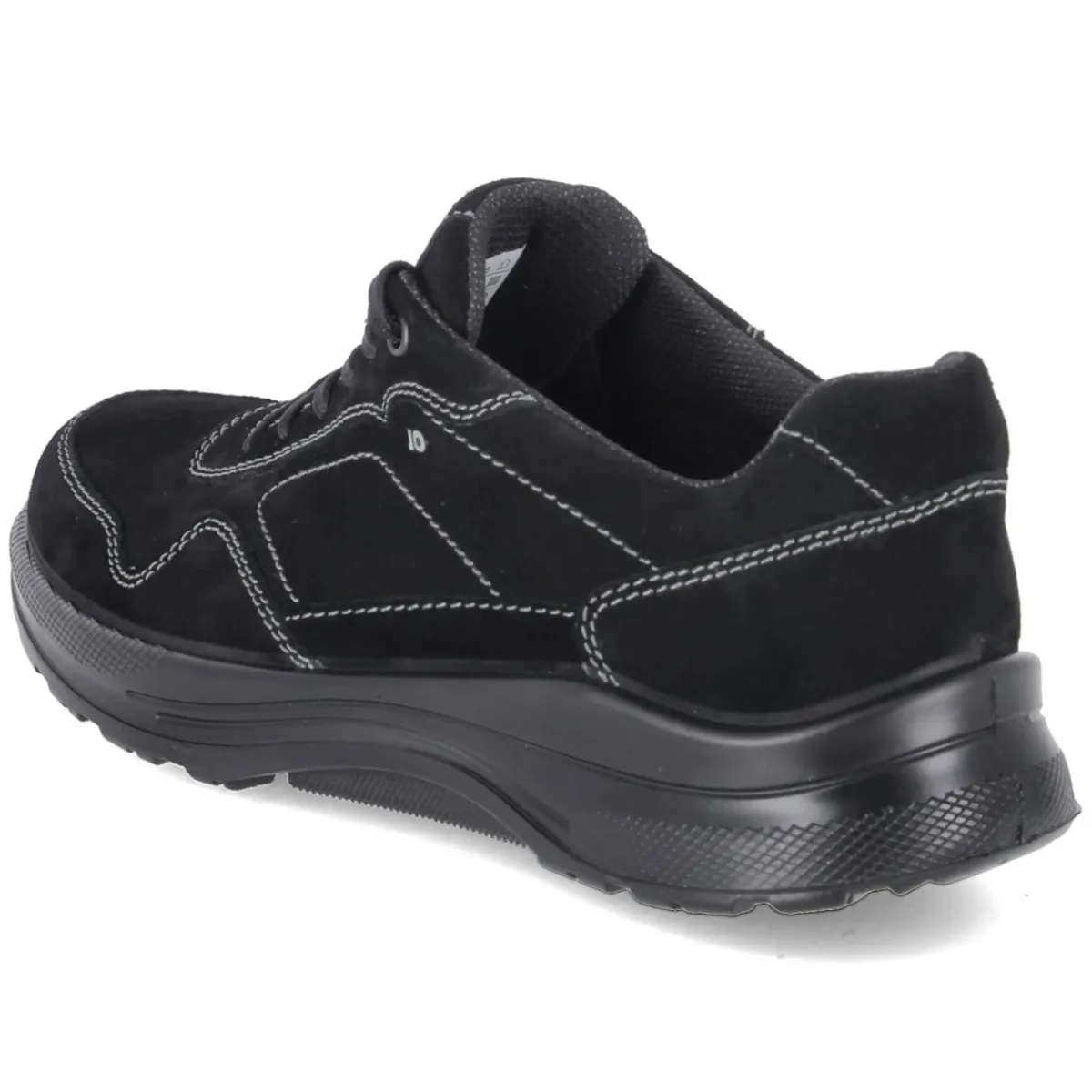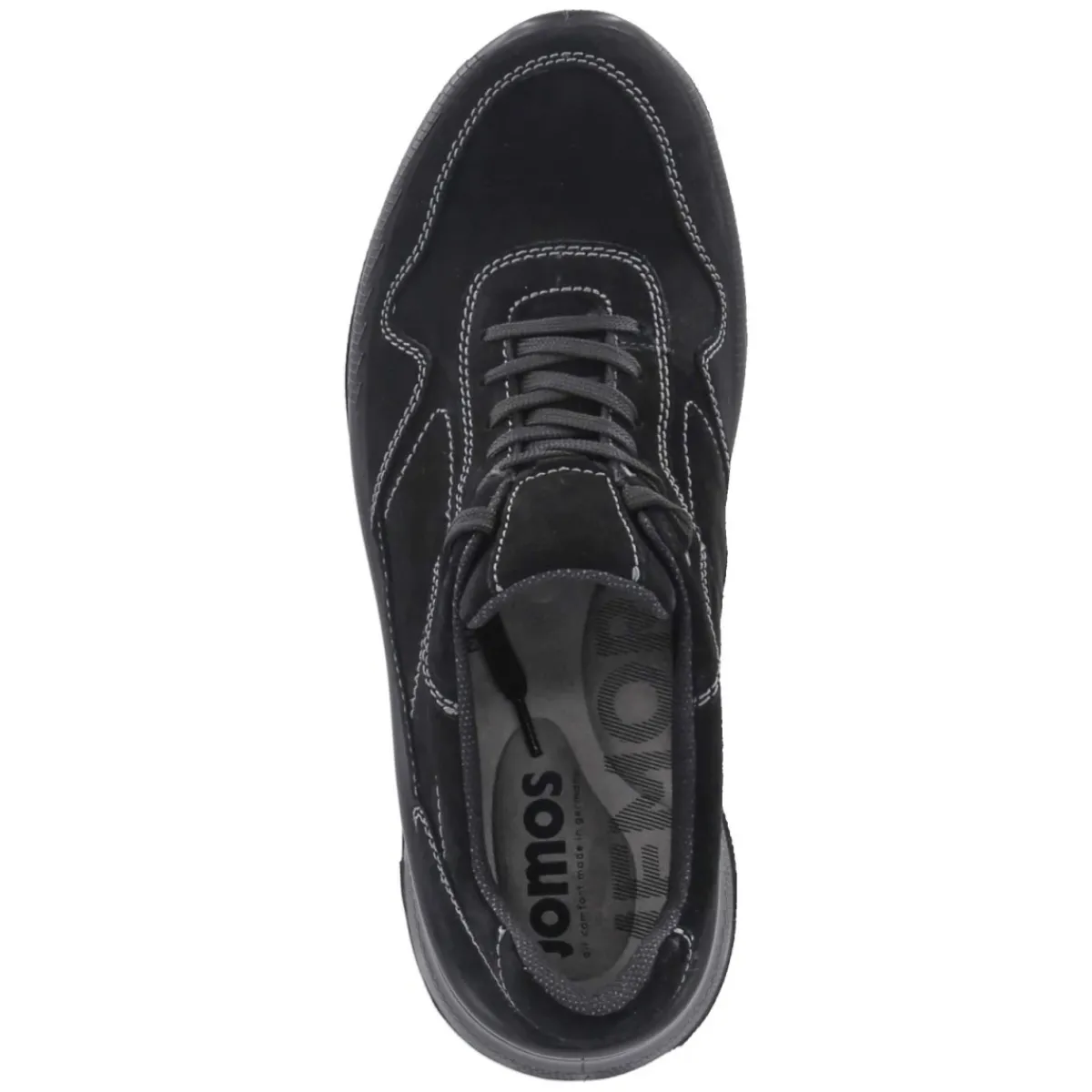 Der schwarze Herren-Halbschuh von Jomos vereint sportliches Design mit zuverlässiger Alltagstauglichkeit. Das Obermaterial aus robustem Rauleder in Echtleder-Qualität zeigt sich widerstandsfähig, während die markanten Ziernähte dem dezenten Look Struktur geben. Schnürsenkel und runde Spitze sorgen für eine komfortable Passform, unterstützt von einem verstärkten Fersen- und Zehenbereich sowie einem gepolsterten Einstieg. Innen verwöhnt eine textile Decksohle; das herausnehmbare Fußbett mit bester Memory-Foam-Fußbettung passt sich weich an und lässt sich bei Bedarf gegen eigene Einlagen tauschen. Die flexible, rutschfeste Laufsohle bietet Grip auf urbanem Terrain. Fällt normal aus und ist damit unkompliziert in der Wahl der Größe. Modetipp: Zu schwarzer Jeans und einem cleanen Overshirt entsteht ein smarter Look, der vom Büro bis in den Feierabend souverän funktioniert.