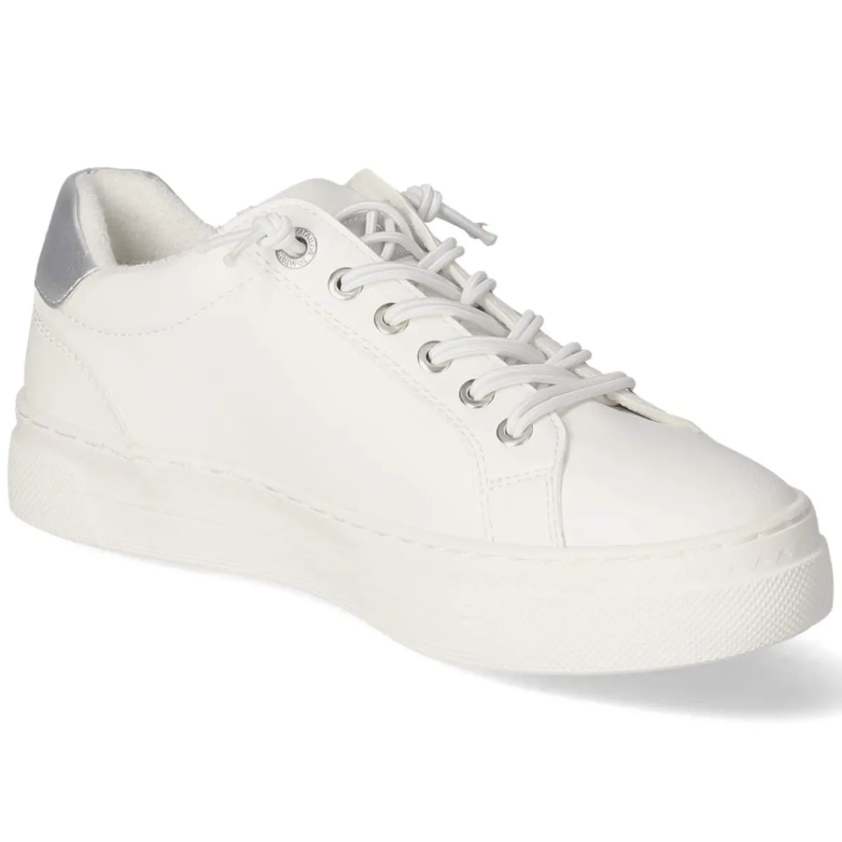 Der Low Sneaker von Tom Tailor vereint cleanes Design und Alltagstauglichkeit. Das weiße Obermaterial aus pflegeleichter Synthetik zeigt sich unempfindlich im täglichen Einsatz, während die runde Schuhspitze und der normal ausfallende Leisten für eine bequeme Passform sorgen. Ein weich gepolsterter Einstieg sowie das gepolsterte Fußbett mit Decksohle aus Textil begleiten durch lange Tage. Schnürsenkel und zusätzlicher Reißverschluss erleichtern das An- und Ausziehen und geben variablen Halt. Eine flexible, rutschhemmende Laufsohle sichert Grip, die verstärkte Ferse stabilisiert jeden Schritt. Silberfarbene Akzente und der Markenanhänger setzen dezente Highlights, die dem minimalistischen Look eine elegante Note verleihen. Modetipp: Für einen frischen City-Look zu hellen Mom-Jeans, gestreiftem Shirt und einer leichten Trenchjacke kombinieren – weiße Socken leicht sichtbar stylen, um den Sneaker akzentuiert in Szene zu setzen.