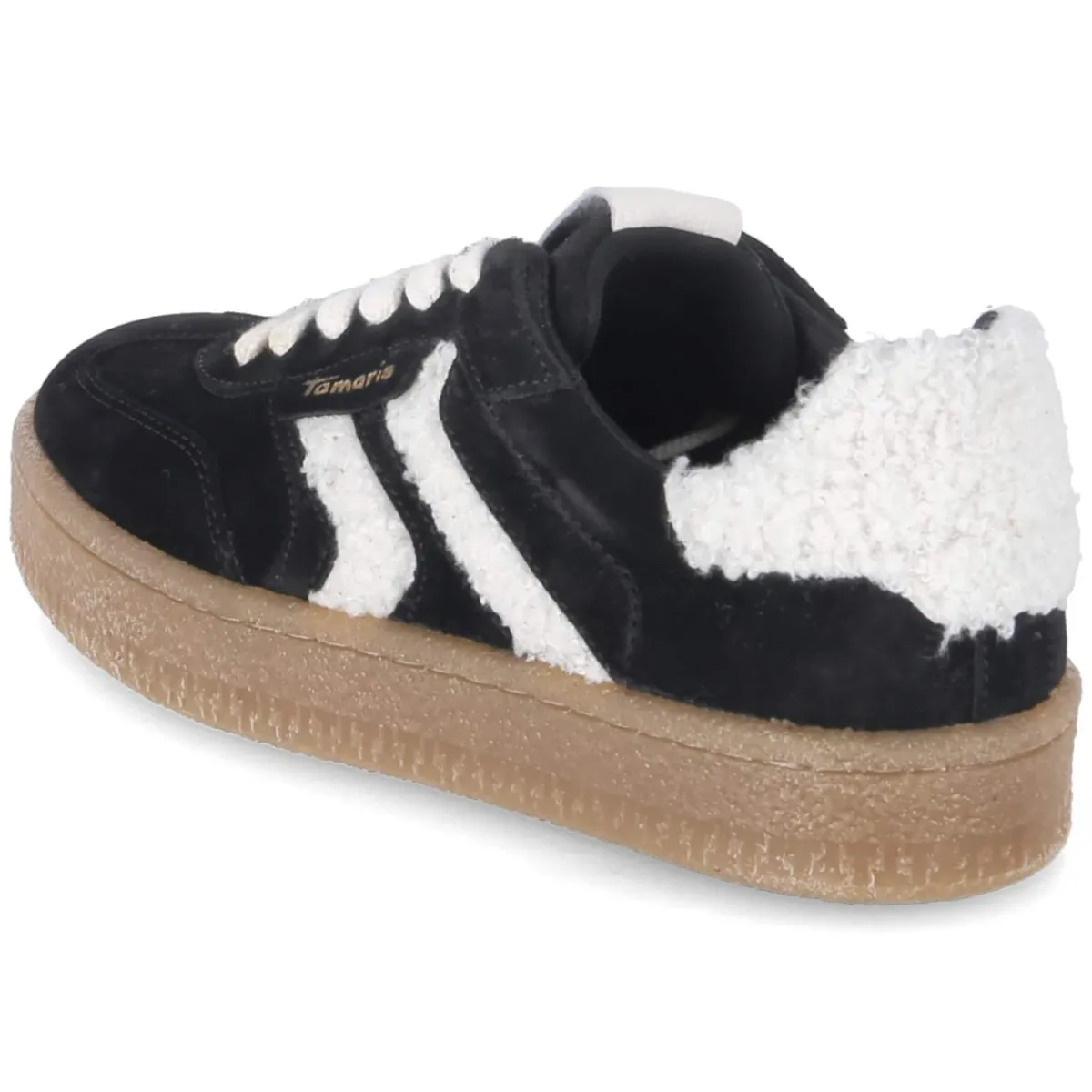 Der Low Sneaker von Tamaris vereint urbanen Style mit Komfort und setzt in tiefem Schwarz auf einen modernen Material-Mix aus Leder und Textil. Weiche Teddyplüsch-Details bringen eine subtile Cozy-Note, während verstärkte Zehen- und Fersenpartien für Langlebigkeit sorgen. Die runde Spitze und der klassische Schnürverschluss unterstreichen die sportliche Silhouette. Innen bietet die textile Decksohle in Kombination mit dem gepolsterten Einstieg ein angenehmes Tragegefühl; das komfortable Wechselfußbett lässt sich individuell anpassen. Die rutschhemmende Laufsohle sorgt für sicheren Halt im Alltag. Dank normaler Passform fällt das Modell größengetreu aus und lässt sich vielseitig kombinieren. Modetipp: in monochromem Look zu Wide-Leg-Jeans, Feinstrick und Oversize-Mantel für lässige Eleganz.