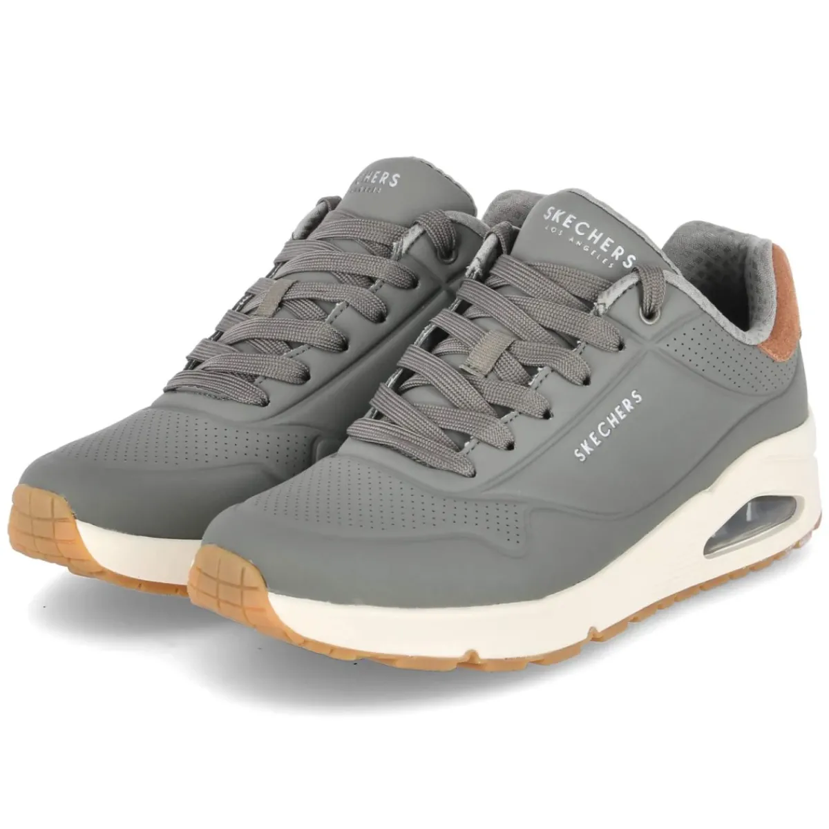 Der Skechers Low Sneaker UNO SUITED ON AIR für Herren kombiniert sportliche Optik mit hohem Tragekomfort. Das pflegeleichte Synthetik-Obermaterial zeigt dynamische Prägungen und wird durch markante Markendetails abgerundet. Eine runde Schuhspitze und der gepolsterte Einstieg sorgen zusammen mit dem verstärkten Zehen- und Fersenbereich für angenehmen Halt. Im Inneren dämpft die beste Memory-Foam-Fußbettung jeden Schritt, unterstützt von der rutschhemmenden Profilsohle, deren Sichtfenster in der Ferse den luftigen Look betont. Die textile Decksohle trägt sich angenehm, der Schnürverschluss hält sicher, und die grüne Farbe lässt sich vielseitig kombinieren. Der Schuh fällt normal aus und bietet dadurch unkomplizierte Größenwahl und gute Kombinationsmöglichkeiten im Alltag. Modetipp: Zu Slim-Jeans in Grau und einem leichten Bomber oder Utility-Jacket kommt das Grün besonders modern zur Geltung.