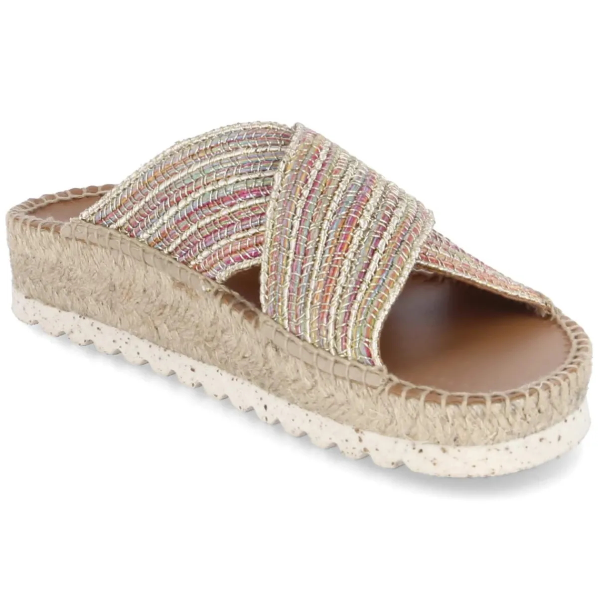 Pantoletten BALI von Toni Pons verbinden sommerliche Leichtigkeit mit raffiniertem Glanz. Das mehrfarbige Design in Bunt-Beige setzt mit feinen Streifen und metallischem Schimmer dezente Akzente, während gekreuzte, breite Riemen aus Textil dem Fuß sicheren Halt geben. Die glitzernde Oberfläche harmoniert mit dem geflochtenen Sohlenrahmen und zitiert den Charme mediterraner Espadrilles. Innen sorgt hautfreundliches Lederfutter in Kombination mit einer Decksohle aus Leder für angenehmen Tragekomfort. Die offene Schuhspitze unterstreicht den luftigen Charakter, der unkomplizierte Schlupfeinstieg ohne Verschluss macht das Modell alltagstauglich. Dank normaler Passform fällt die Größe verlässlich aus und die Styles lassen sich vielseitig kombinieren – vom City-Look bis zum Strandspaziergang. Modetipp: Zu einem cremefarbenen Leinenkleid und einer Korbtasche entsteht ein eleganter, entspannt wirkender Sommerlook.