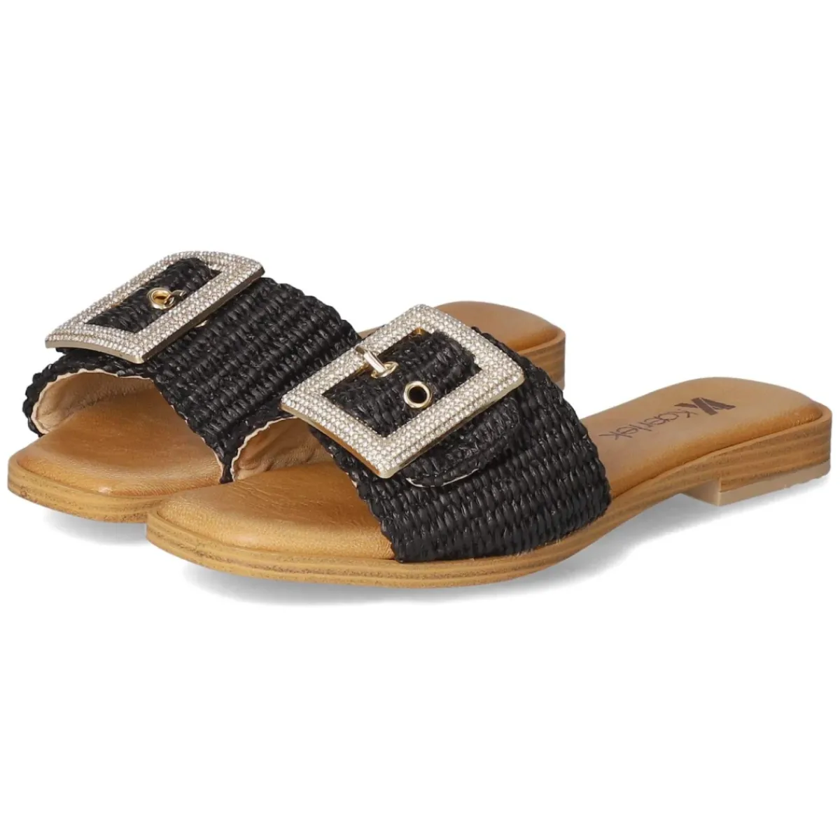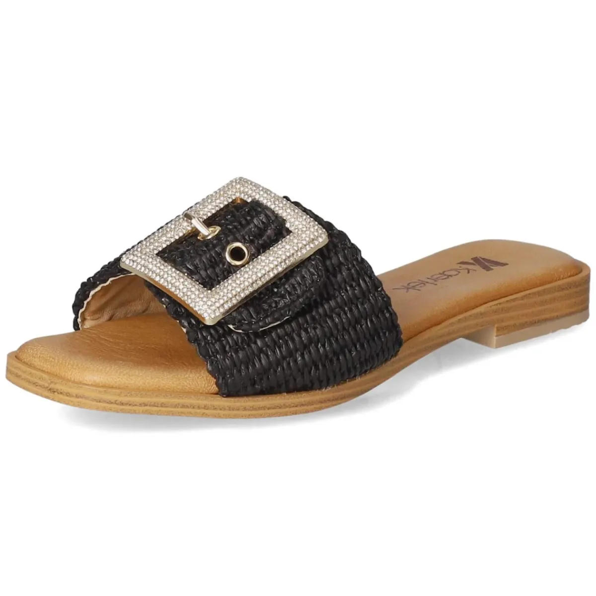 Die Pantoletten NERO von Kaerlek verbinden zurückhaltende Eleganz mit sommerlicher Struktur. Das schwarze Obermaterial aus Synthetik setzt den modernen Material-Mix in Szene, während die geflochtene Sisaloptik an der Sohle einen natürlichen Akzent liefert. Die goldfarbene Schnalle mit funkelnden Schmucksteinen ist nicht nur ein Blickfang, sondern erlaubt ein unkompliziertes Anpassen. Ein weich gepolstertes Fußbett mit Decksohle aus Leder sorgt für angenehmen Komfort, die flexible, rutschhemmende Laufsohle für verlässlichen Halt. Mit offener Schuhspitze und normal ausfallender Passform eignen sich die Pantoletten für vielfältige Anlässe vom Café bis zur Strandpromenade. Modetipp: Zu Leinen-Set in Sand und schwarzem Top kombinieren, dazu filigraner Goldschmuck und eine Bast-Clutch für ein harmonisches Finish.