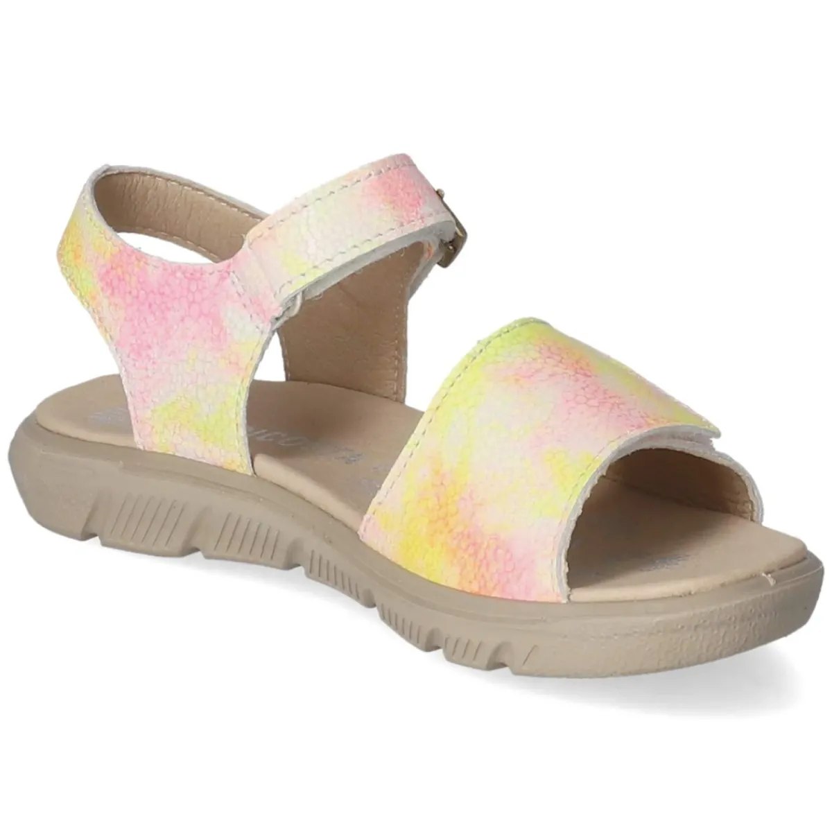 Die Ricosta Sandale SAMIRA in Pink vereint verspielte Optik und alltagstauglichen Komfort. Der sanfte Farbverlauf von Rosa bis Gelb wird durch eine goldfarbene Zierschnalle akzentuiert, während zwei praktische Klettverschlüsse für schnellen Einstieg und sicheren Halt sorgen. Offene Schuhspitze, atmungsaktives Echtleder und eine hautfreundliche Lederdecksohle schaffen ein luftiges Tragegefühl an warmen Tagen. Das vorgeformte, weich gepolsterte Lederfußbett unterstützt den Fuß, die flexible Laufsohle begleitet jeden Schritt geschmeidig. Die Passform fällt normal aus und entspricht der Weite Mittel. So entsteht eine leichte Sommer-Sandale, die Spielplatz, Stadtbummel und Familienfeier mühelos verbindet. Modetipp: Zu Jeansshorts und einem gestreiften T‑Shirt kombinieren, dazu goldene Haarspange oder Armreif, die die Schnalle aufgreifen.