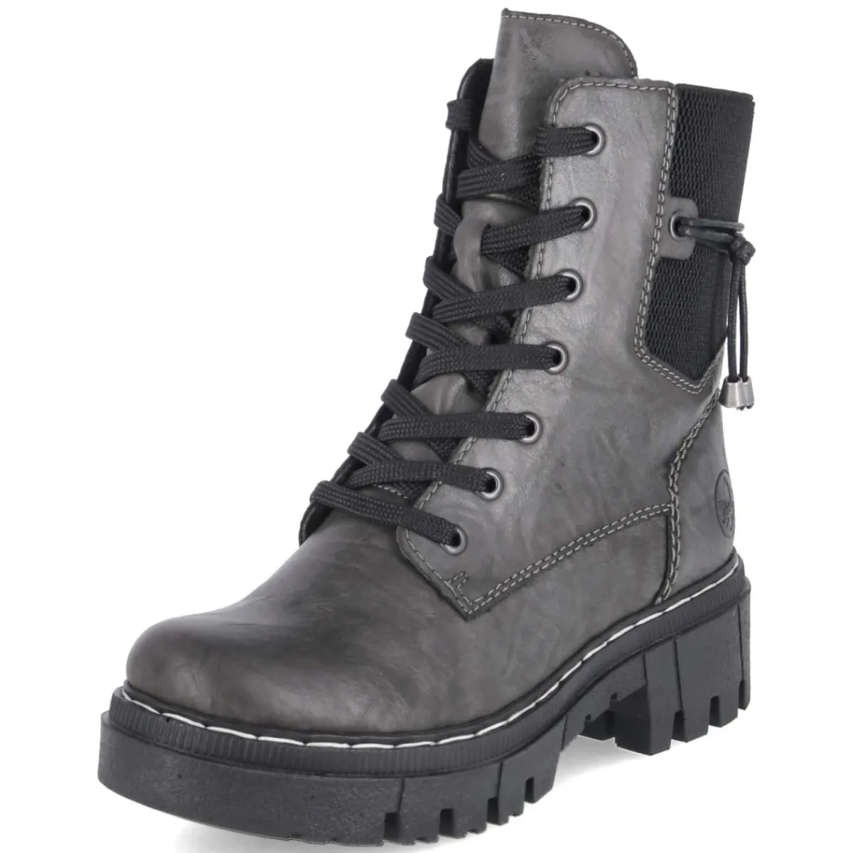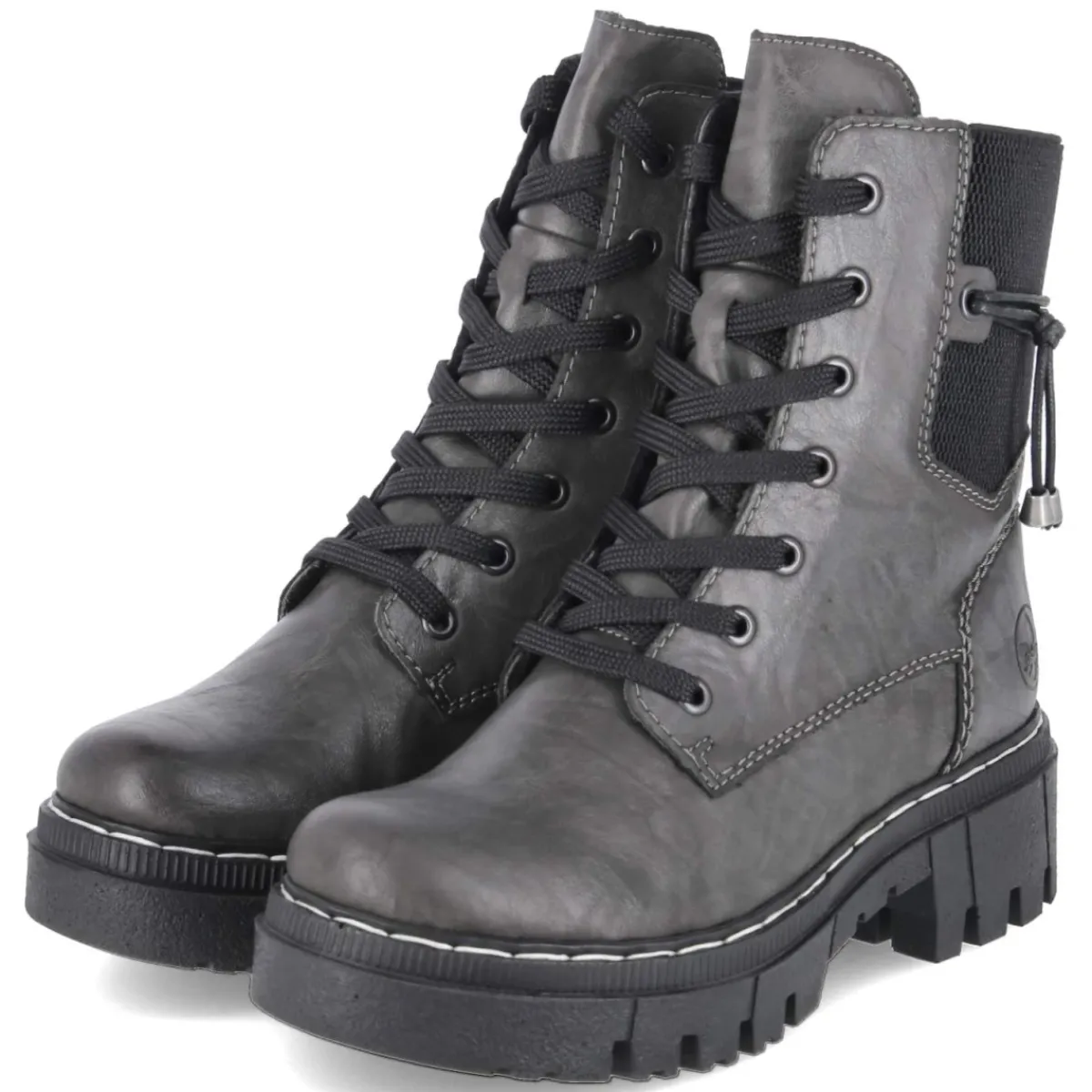 Diese grauen Schnürboots von Rieker setzen auf einen gelungenen Mix aus Komfort und urbanem Stil. Das pflegeleichte Synthetik-Obermaterial zeigt eine leichte Knautschoptik, während der 5 cm hohe Blockabsatz mit kleinem Plateau dezent streckt und sicheren Stand vermittelt. Dank rutschfester Profilsohle, verstärktem Fersenbereich und rund gearbeiteter Spitze entsteht ein stabiles, entspanntes Laufgefühl. Das relaxtes Leichtgewicht punktet mit weichem Fußbett und Textil-Decksohle, das leichte Futter wärmt an kühlen Tagen. Schnürsenkel in Kombination mit Reißverschluss erleichtern den Einstieg und erlauben eine passgenaue Regulierung; ein seitlicher Stretcheinsatz sowie ein zierendes Band ergänzen das Design. Die Passform fällt normal aus und bietet verlässliche Größe. Modetipp: Zu grauen Wide-Leg-Jeans, meliertem Strickpullover und langem Wollmantel in Creme entsteht ein harmonischer Ton-in-Ton-Look mit modernem Finish.