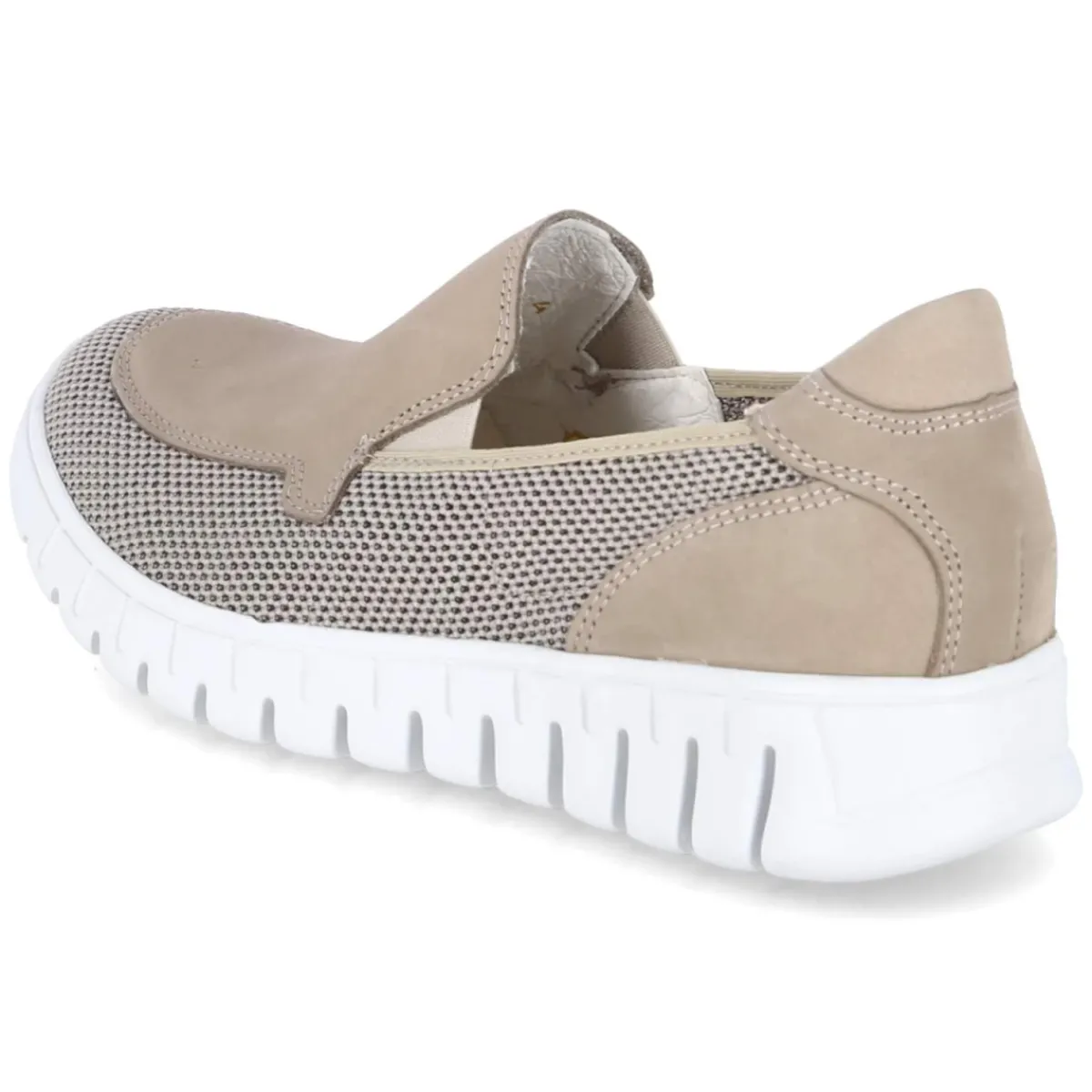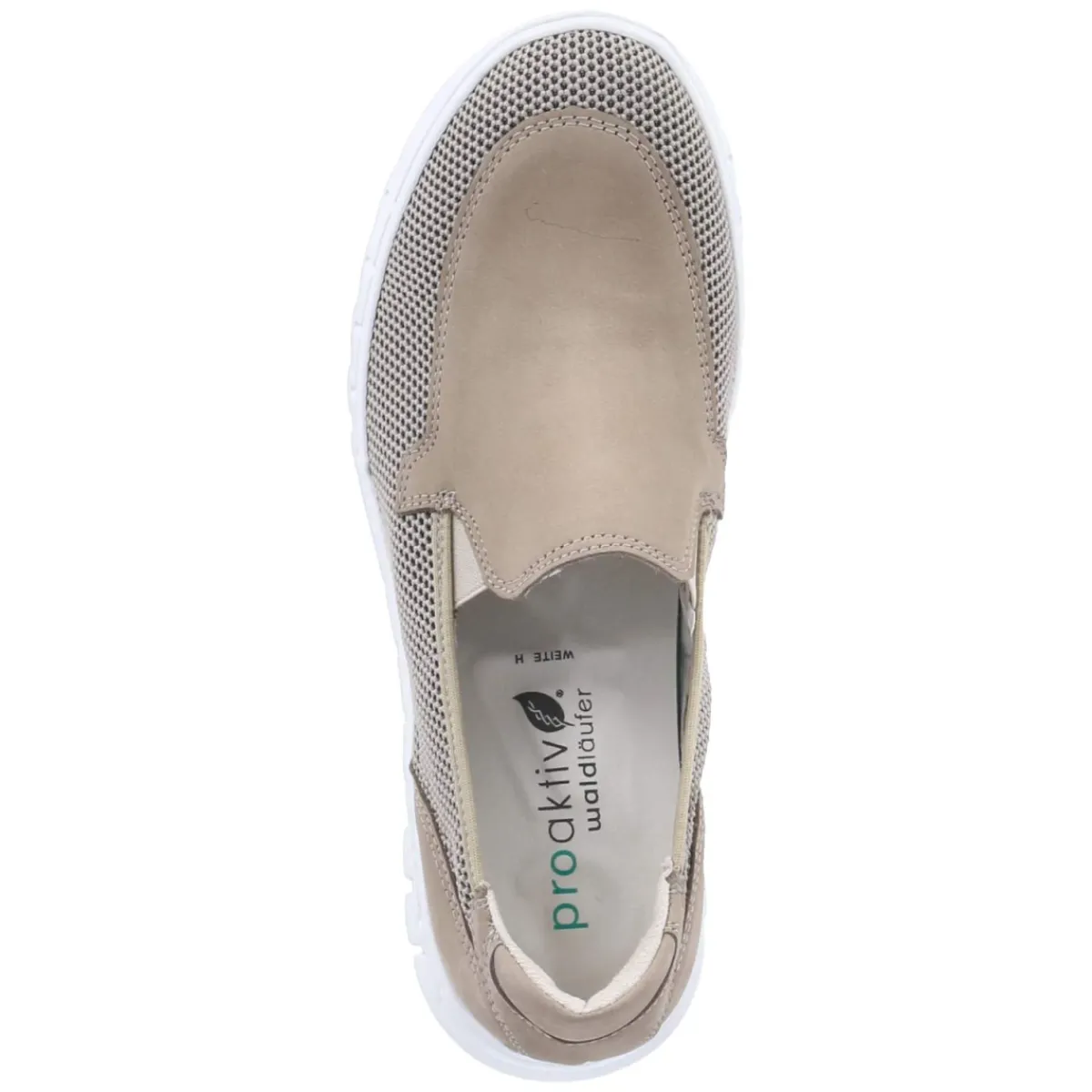 Der Slipper BIRDY von Waldläufer verbindet einen modernen Material-Mix aus Leder und Textil mit lässigem Komfort. Das taupefarbene Design setzt auf eine runde Schuhspitze und seitliche Stretcheinsätze, die den Einstieg erleichtern und den Spann sanft umschmeicheln. Meshteile in geflochtener Optik sorgen für leichte Luftigkeit, während die verstärkte Ferse Stabilität bietet. Die gepolsterte, herausnehmbare Lederdecksohle ist hautfreundlich und lässt Raum für eigene Einlagen. Als relaxtes Leichtgewicht mit sehr flexibler, rutschfester Laufsohle mit Profil eignet sich der Slipper für längere Tage auf den Beinen. Der Passformhinweis fällt normal aus, der Verschluss bleibt bewusst weg für ein cleanes Bild. Modetipp: Ton-in-Ton mit Leinenhose und Feinstricktop trägt der Slipper ein edles Monochrom-Statement; ein silbernes Armband setzt einen subtilen Akzent.