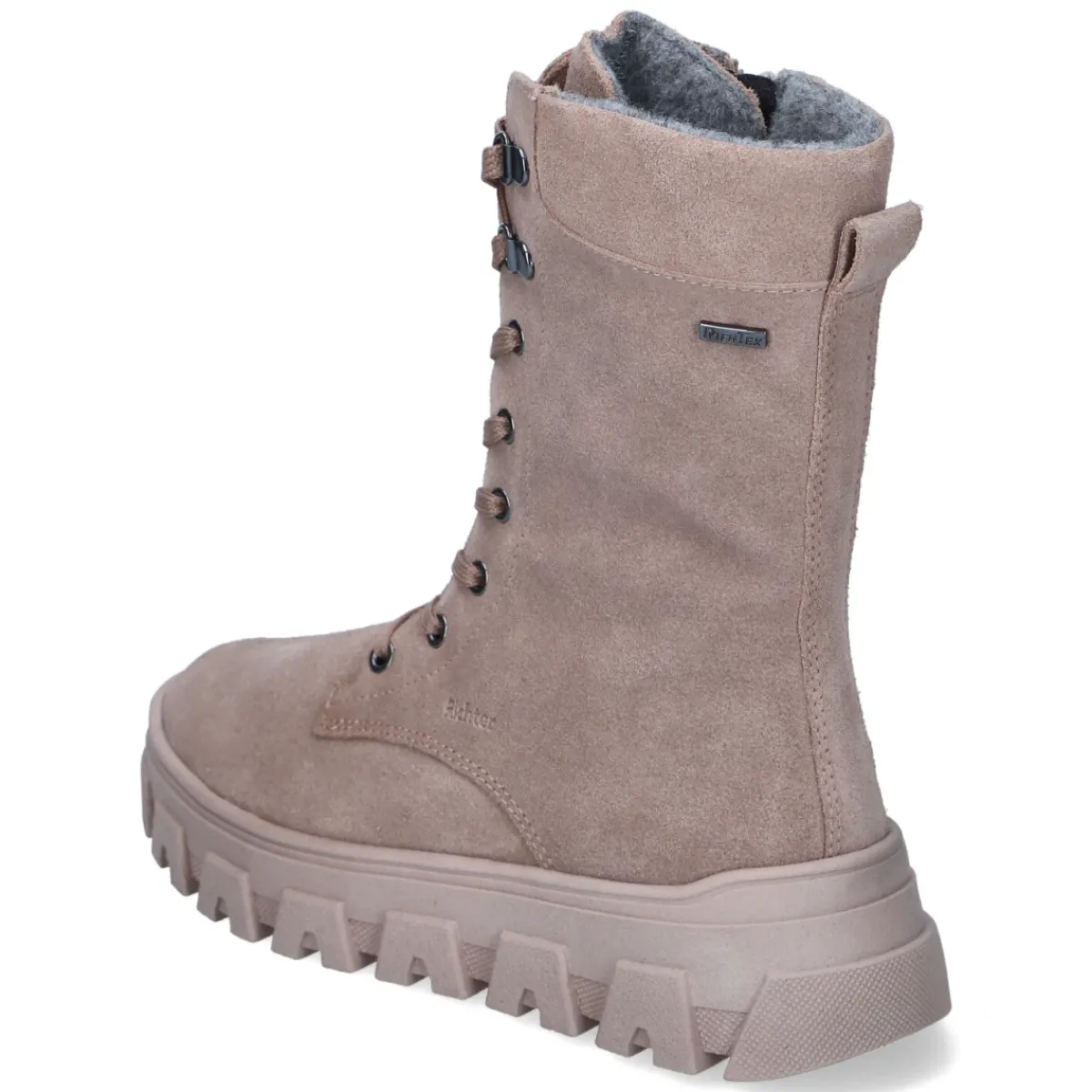 Warme Kinderfüße bekommen in den Winterstiefeletten von Richter einen stylischen Begleiter: weiches Rauleder in sanftem Beige, runde Kappe und dezente Markendetails verbinden Funktion und Design. Das RichTEX-Equipment schützt zuverlässig vor Nässe, während atmungsaktives Warm- und Fleecefutter sowie ein leicht gepolsterter Einstieg für behagliches Klima sorgen. Schnürsenkel erlauben die perfekte Anpassung, der seitliche Reißverschluss und die Anziehlasche erleichtern den Einstieg. Die herausnehmbare, leicht gepolsterte Textil-Decksohle und das Wechselfußbett bieten flexible Tragemöglichkeiten. Eine flexible, rutschhemmende Profilsohle mit 4 cm Plateau gibt Halt auf winterlichen Wegen. Größenhinweis: fällt normal aus. Modetipp: Ton-in-Ton zu Steppjacke und Strick in Creme wirkt der beige Ton besonders modern.