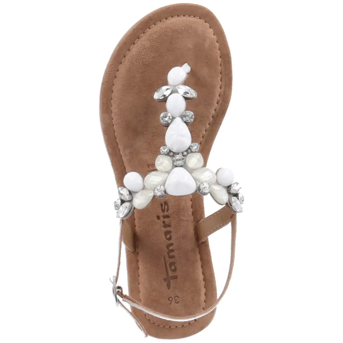 Dieser weiße Zehentrenner von Tamaris verbindet feminine Eleganz mit sommerlicher Leichtigkeit. Das Obermaterial aus Leder und Textil schmiegt sich angenehm an den Fuß, während die offene Schuhspitze und die lederne Decksohle für ein luftiges Tragegefühl sorgen. Für Komfort steht das weich gepolsterte Fußbett, das auch bei längeren Anlässen überzeugt. Die fein funkelnden Schmucksteine verleihen dem festlichen Design einen edlen Akzent, ideal für besondere Sommermomente. Dank Schnalle mit Elastikeinsatz sitzt der Riemen sicher, ohne einzuengen, und die flexible, rutschfeste Laufsohle gibt zuverlässigen Halt. In der Größe fällt das Modell normal aus und bietet so eine unkomplizierte Passform für Damen. Modetipp: Zu fließenden Midikleidern in Pastelltönen oder einer weißen Leinenhose mit Satin-Top kommt der strahlende Look besonders harmonisch zur Geltung.