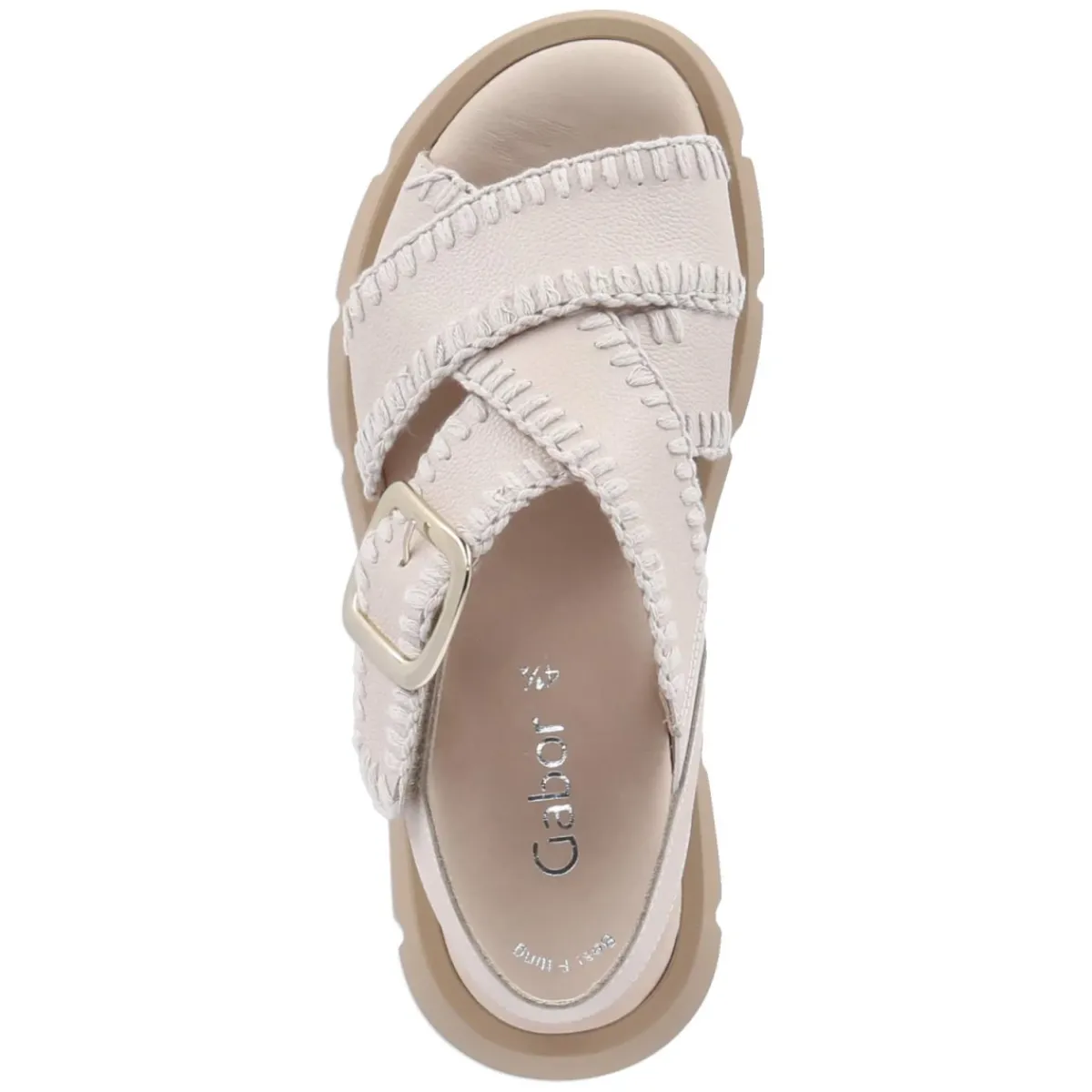 Diese Gabor Sandalen in elegantem Beige überzeugen mit einer harmonischen Mischung aus Komfort und zeitloser Ästhetik. Das Obermaterial aus geschmeidigem Glattleder und die offene Schuhspitze unterstreichen die sommerliche Leichtigkeit, während die gekreuzten, breiten Riemen mit markanten Ziernähten ein stilprägendes Detail setzen. Ein 4,5 cm hohes Plateau verleiht eine sanfte Höhe und sorgt in Kombination mit dem gepolsterten Fußbett sowie der Lederdecksohle für angenehmes Laufgefühl. Der praktische Klettverschluss mit Klettriemen und goldener Zierschnalle ermöglicht passgenauen Halt. Dank normaler Passform fällt das Modell größengetreu aus und eignet sich für vielseitige Anlässe von City bis Gartenparty. Modetipp: Mit einem locker fallenden Leinenkleid, zarten Goldaccessoires und einer Korbtasche entsteht ein mühelos eleganter Sommer-Look in warmen Naturtönen.