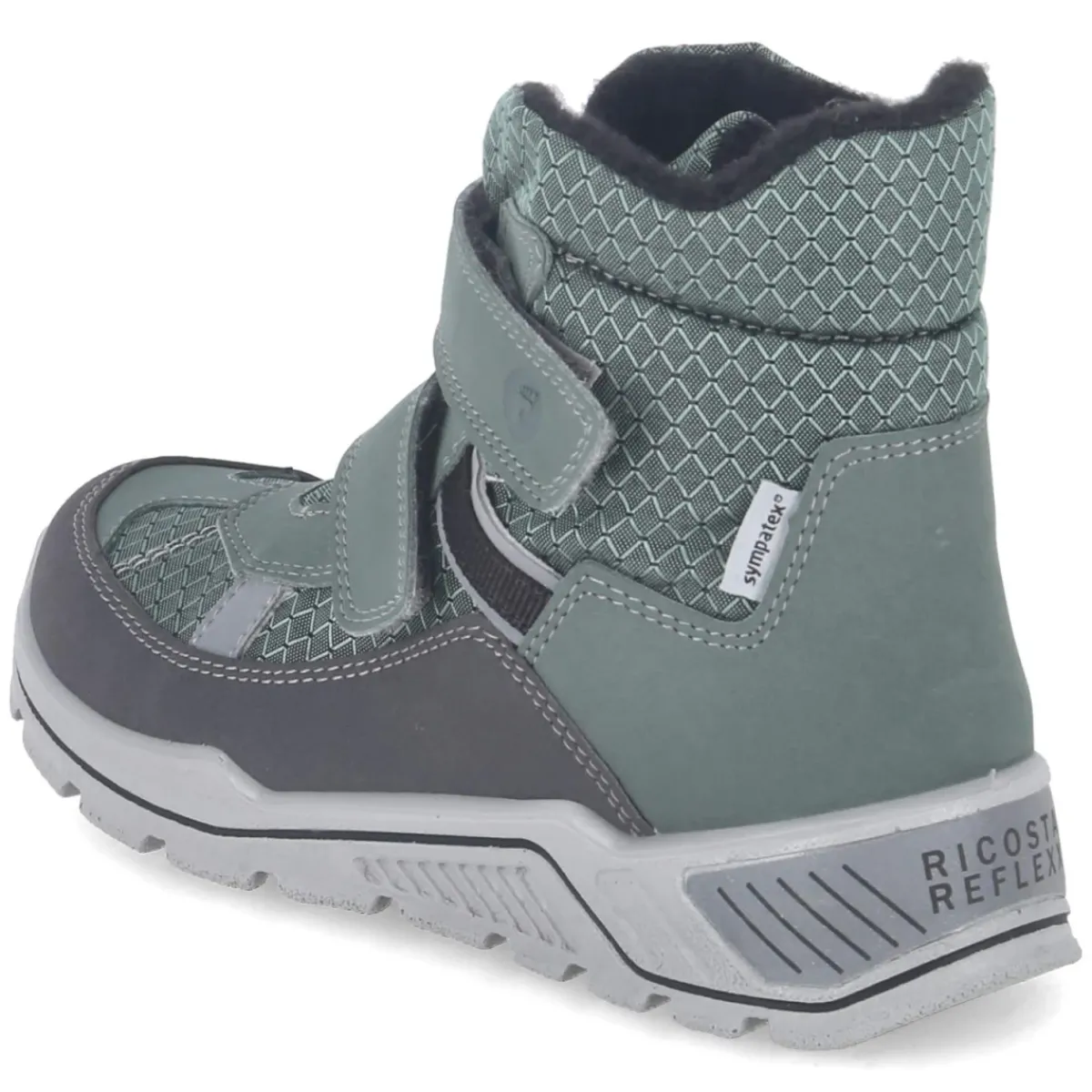 Der Schneeboot GABRIS von Ricosta bringt Grundschulkinder sicher durch nasse und kalte Tage. Das grüne, gemusterte Obermaterial aus Textil und Synthetik trifft auf eine Sympatex-Membran, die zuverlässig wasserfest und atmungsaktiv schützt. Warmfutter und gepolsterter Einstieg umschließen den Fuß angenehm, während die runde Schuhspitze und das herausnehmbare Wechselfußbett für bequemen Sitz sorgen. Dank praktischer Klettverschlüsse gelingt das An- und Ausziehen schnell, unterstützt von einer Anziehlasche. Verstärkungen an Ferse und Zehen geben zusätzliche Stabilität, die rutschfeste Profilsohle sorgt für Grip auf winterlichen Wegen. Reflektierende Details erhöhen die Sichtbarkeit in der Dämmerung. Die Passform fällt normal aus, die textile Decksohle trägt sich weich. Modetipp: Mit wattierter Funktionsjacke, Strickmütze und Thermojeans entsteht ein stimmiger Outdoor-Look, bei dem das frische Grün einen lebhaften Farbakzent setzt.