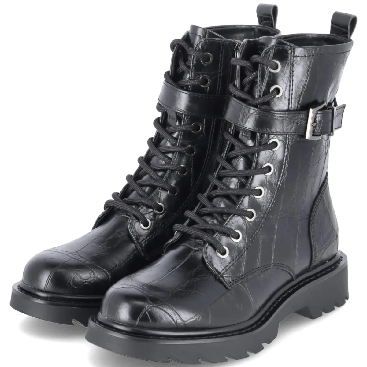Der Schnürboots von Tamaris verbindet markante Reptil-Optik in tiefem Schwarz mit funktionalem Komfort. Das vegane Obermaterial aus Synthetik und die runde Spitze schaffen eine moderne, vielseitige Silhouette. Ein 4 cm hoher Blockabsatz sorgt für stabilen Auftritt, während das gepolsterte Fußbett und die textile Decksohle den ganzen Tag über weich abfedern. Das leichte Fleecefutter wärmt an kühlen Tagen, ohne aufzutragen. Dank Schnürung und bequemem Reißverschlußeinstieg lässt sich die Passform präzise anpassen, unterstützt von verstellbarem Knöchelriemen und Anziehlasche. Die verstärkte Ferse verleiht Halt, die starke, rutschfeste Profilsohle bietet zuverlässigen Grip. Mit Schafthöhe ca. 17 cm und Umfang ca. 24 cm fällt das Modell normal aus und trägt nicht auf. Modetipp: Mit Cropped-Jeans und Oversize-Blazer entsteht ein cleaner City-Look, der die reptilgeprägte Struktur elegant in Szene setzt.