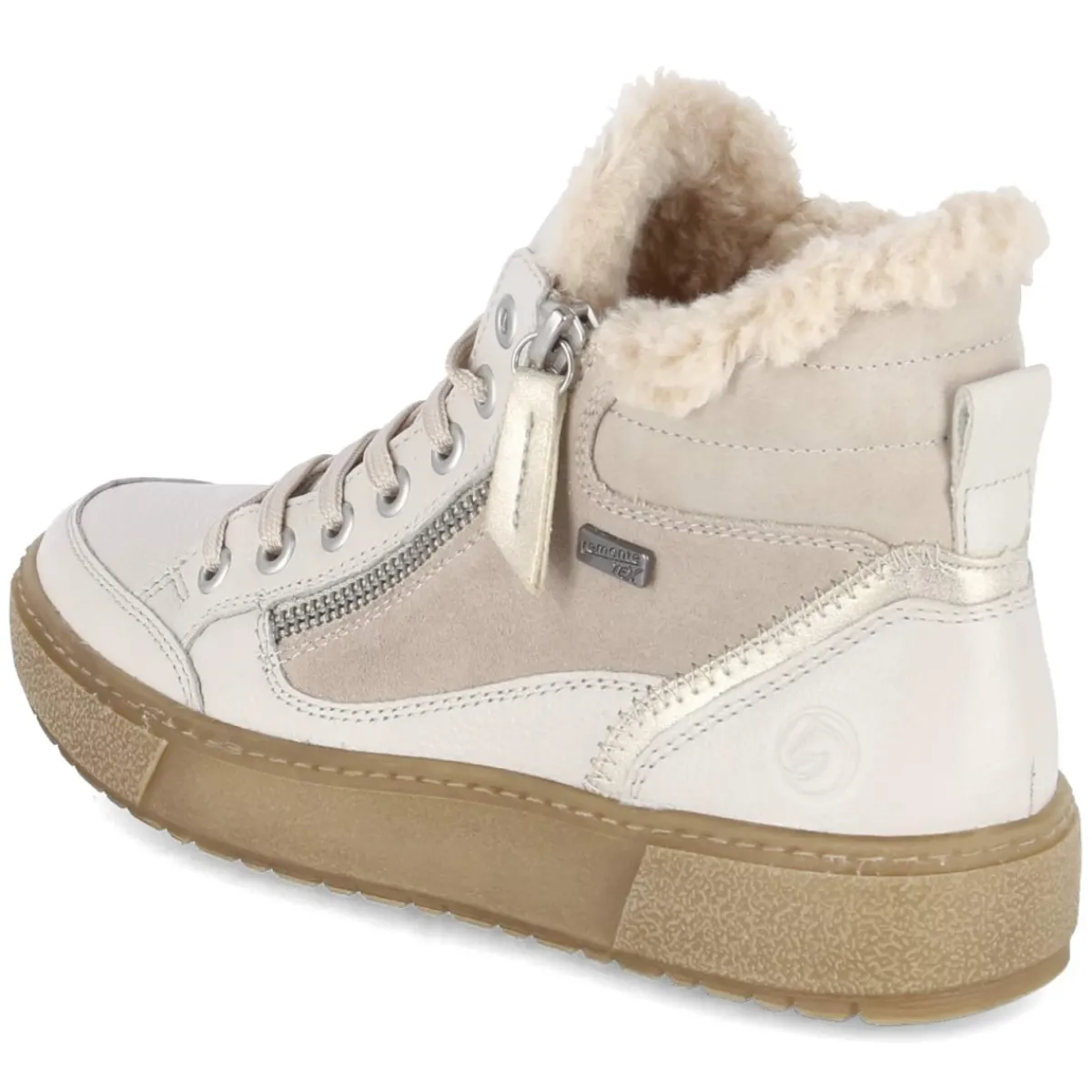 Die Damen-Schnürstiefeletten von Remonte vereinen sportliche Optik mit wintertauglicher Funktion. Das Obermaterial aus Leder und Synthetik zeigt sich in vielseitigem Beige, die runde Spitze und der gepolsterte Einstieg sorgen für angenehmen Tragekomfort. Wasserabweisend und zugleich wasserfest konstruiert, bleibt der Fuß dank atmungsaktiver Eigenschaften und warmem Teddyfutter behaglich trocken. Schnürung und seitlicher Reißverschluss ermöglichen einen schnellen Einstieg und eine passgenaue Regulierung, das weich gepolsterte Wechselfußbett mit Textildecksohle entlastet bei langen Tagen. Verstärkte Fersen- und Zehenbereiche, Anziehlasche sowie eine flexible, rutschfeste Laufsohle runden die robuste Ausstattung ab. Die Passform fällt normal aus, sodass der Alltag souverän gemeistert wird. Modetipp: Ton-in-Ton mit Strick in Sand und einem beigen Wollmantel kombinieren, dazu eine breite Cordhose für einen modernen, urbanen Winterlook.