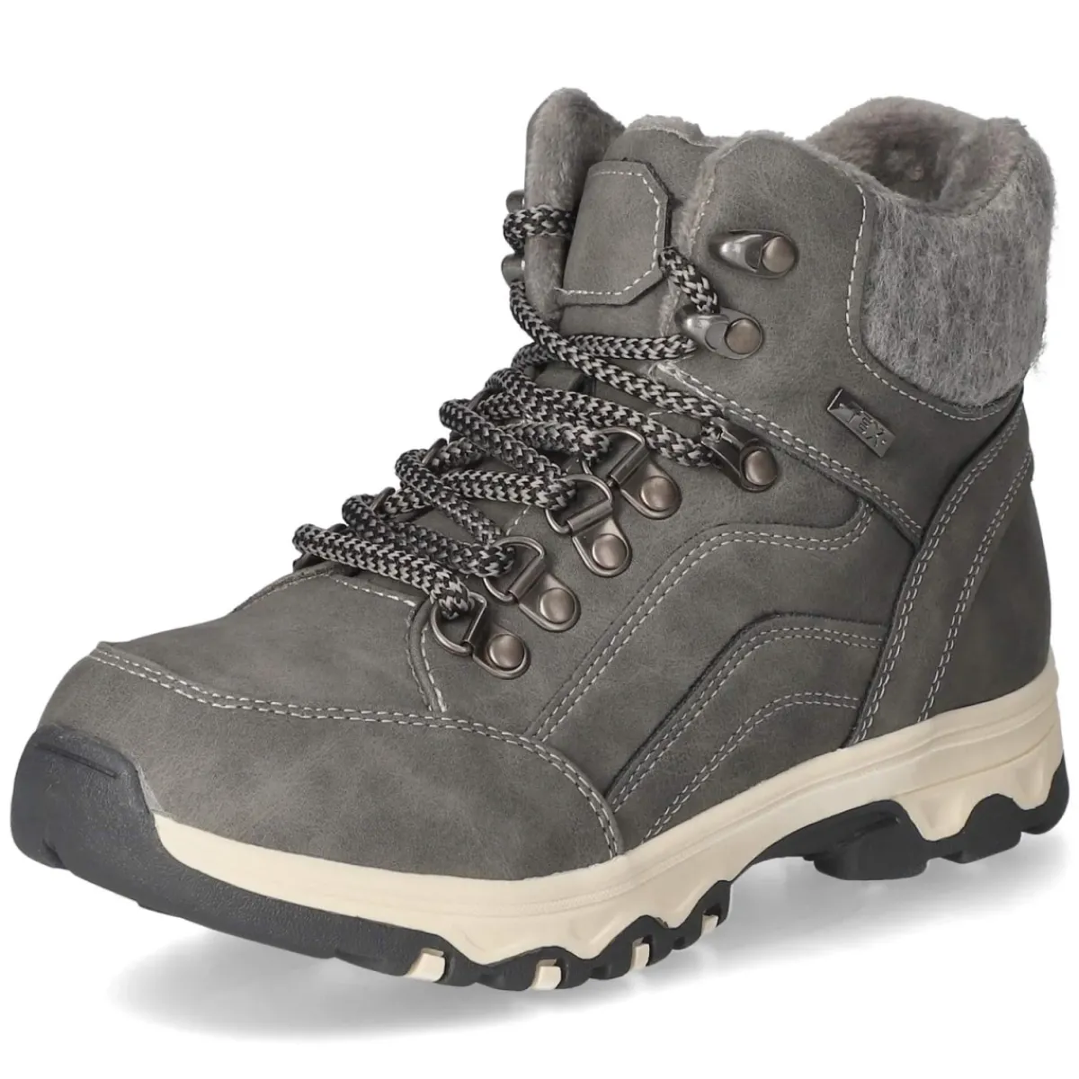 Die Schnürstiefeletten von Jane Klain vereinen urbane Lässigkeit mit funktionalem Komfort. Der robuste Mix aus Textil und Synthetik wirkt dank grauer Farbgebung besonders vielseitig, während die wasserabweisende TEX-Ausstattung und das leichte Warmfutter an kühlen Tagen angenehm schützen. Eine runde Schuhspitze und der in Filzoptik gehaltene Schaftrand sorgen für einen soften Look, der durch die Anziehhilfe praktisch ergänzt wird. Langes Schnüren entfällt dank Reißverschluss, die Schnürung ermöglicht dennoch individuelle Anpassung. Das Wechselfußbett unterstützt unterschiedliche Einlagenbedürfnisse, die flexible, rutschfeste Profilsohle gibt sicheren Halt. Verstärkte Zehen- und Fersenbereiche erhöhen die Langlebigkeit, der Größeneindruck fällt normal aus. Modetipp: Zu Mom-Jeans, kuscheligem Strickpullover und einem Oversize-Wollmantel kombinieren oder als spannender Kontrast zum Midi-Strickkleid mit blickdichter Strumpfhose tragen.