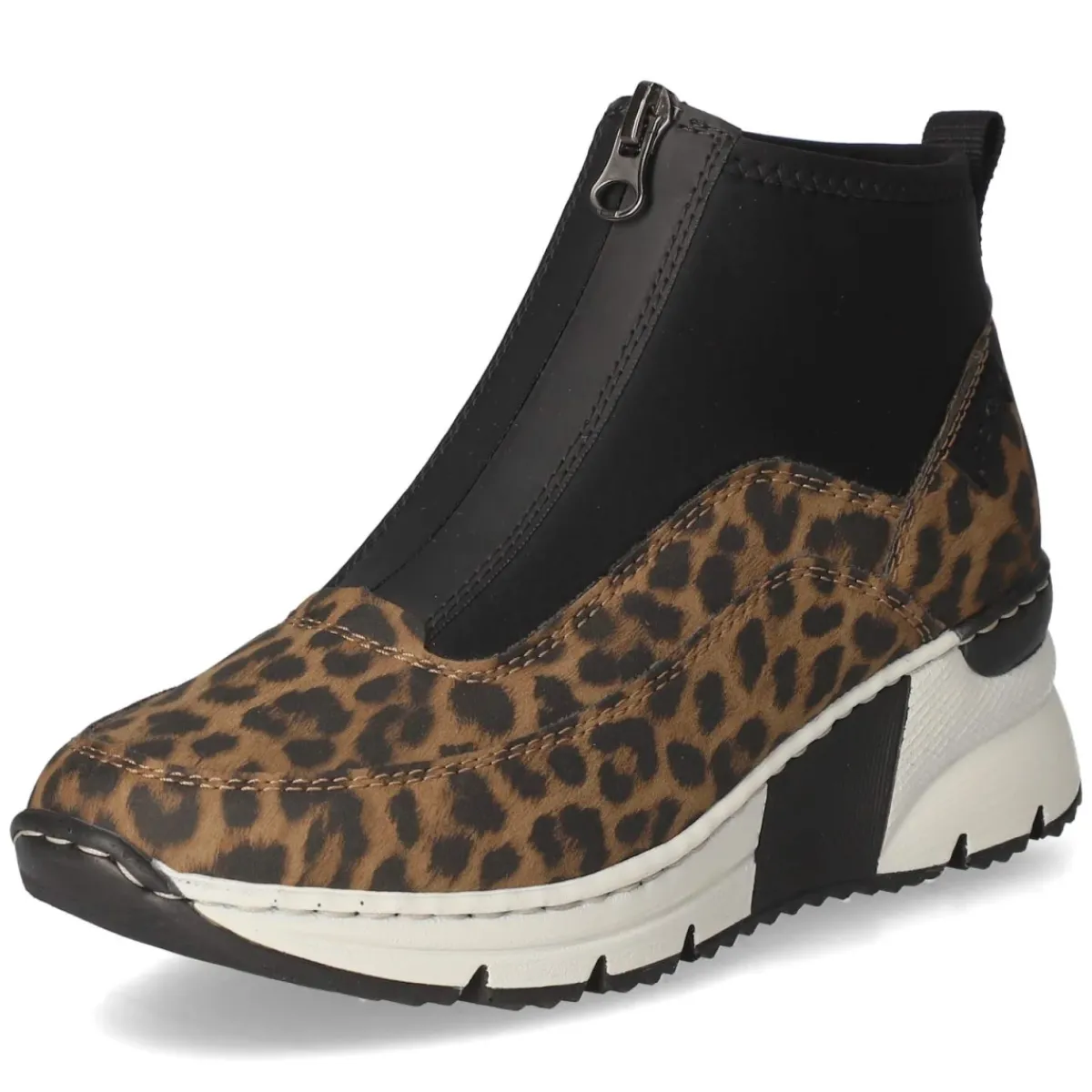 Die Rieker Stiefeletten in warmem Braun verbinden urbanen Chic mit alltagstauglichem Komfort. Ein moderner Material-Mix aus Textil und Synthetik setzt dank Leopardenmuster spannende Akzente, während der 5,5 cm hohe Keilabsatz eine sanfte Erhöhung und sicheren Stand bietet. Die runde Schuhspitze und die textile Decksohle umschmeicheln den Fuß, das komfortable Wechselfußbett ermöglicht individuelle Anpassung, etwa für eigene Einlagen. Ein bequemer Reißverschlußeinstieg und die praktische Anziehlasche erleichtern das Hineinschlüpfen, verstärkte Zehen- und Fersenbereiche erhöhen die Robustheit. Die flexible, rutschhemmende Laufsohle sorgt auf wechselnden Untergründen für Trittsicherheit. Markendetails unterstreichen die Qualität, der Schnitt fällt normal aus. Modetipp: Mit Cropped-Jeans und einem camelfarbenen Mantel entsteht ein eleganter City-Look; zu Strickkleid in Creme wird das Animal-Detail zum stilvollen Hingucker.