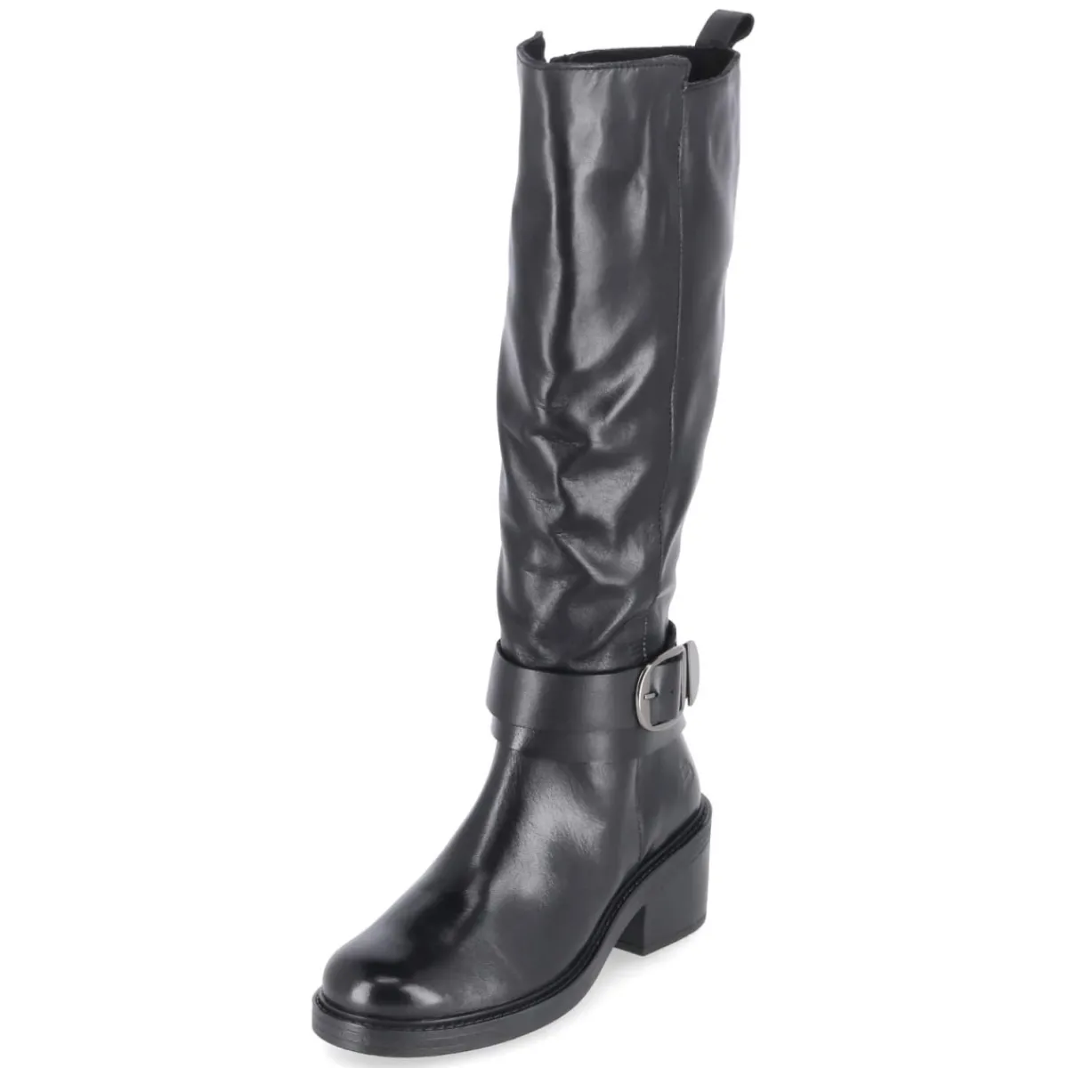 Schwarzer Damen-Stiefel von Bullboxer aus langlebigem Echtleder, der mit klarer Silhouette und zuverlässiger Verarbeitung überzeugt. Der 6 cm hohe Blockabsatz bietet angenehme Höhe bei stabiler Basis, die runde Schuhspitze rundet den zeitlosen Look ab. Dank bequemer Reißverschlußeinstieg, Anziehlasche und gepolstertem Fußbett gelingen lange Tage mühelos. Leichtes Fleecefutter wärmt an kühlen Tagen, der verstärkte Fersenbereich erhöht die Stabilität. Eine rutschhemmende Laufsohle ohne Profil sorgt dennoch für Halt, während ein Riemen mit Schnalle im Knöchelbereich stilvolle Akzente setzt. Schaft ca. 39 cm hoch, 36 cm Umfang. Größenhinweis: fällt kleiner aus; daher eine Nummer größer bestellen. Modetipp: Besonders wirkungsvoll zu Midikleid in Feinstrick und Oversize-Mantel, alternativ über schmale Jeans mit Trench.