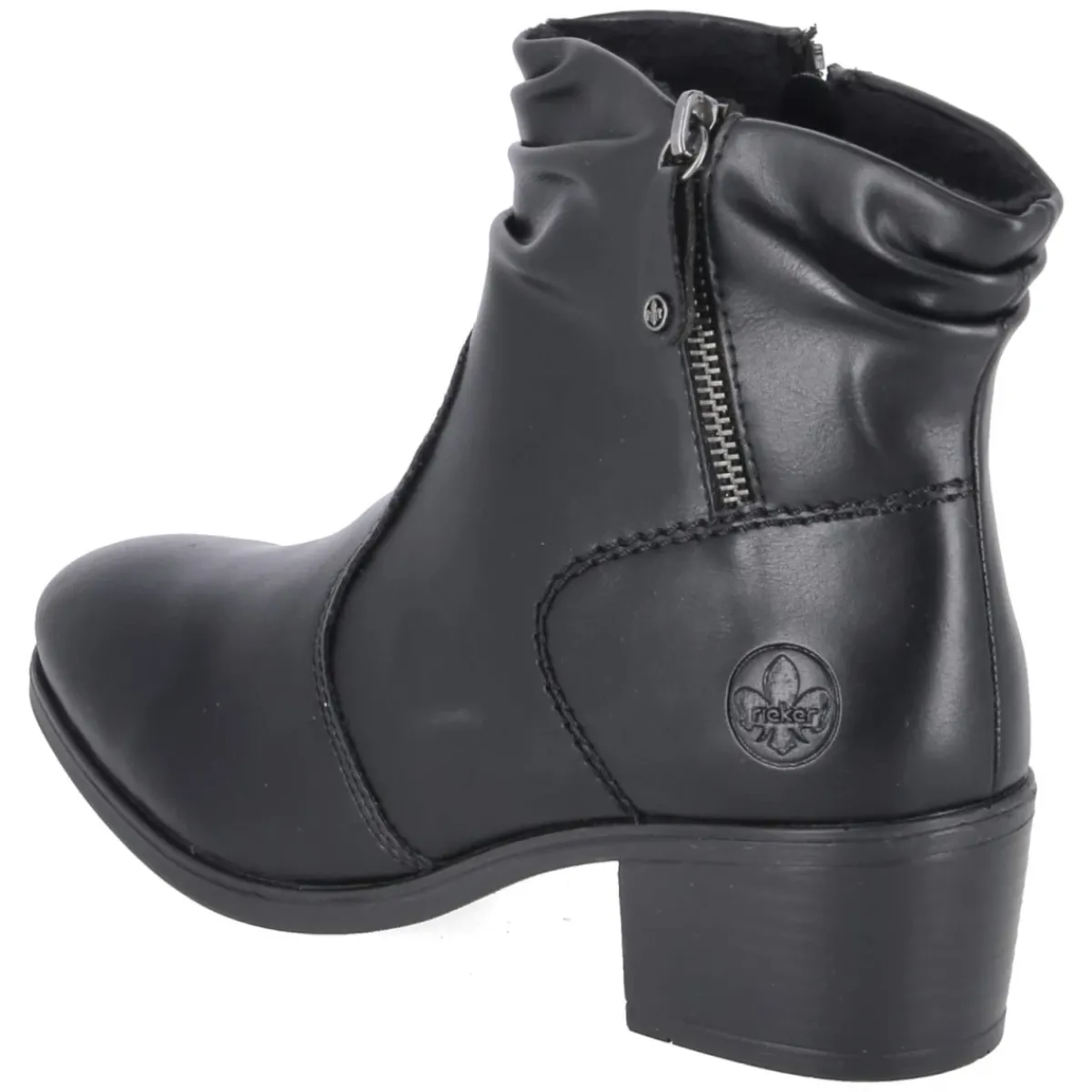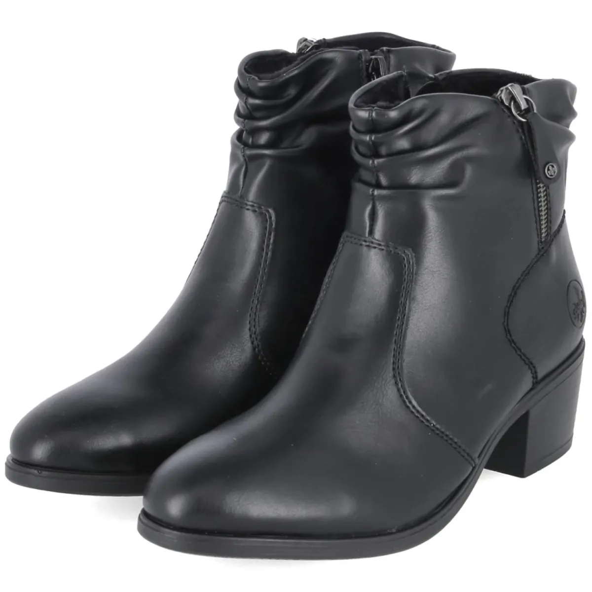 Diese schwarzen Rieker-Stiefeletten verbinden zeitloses Design mit durchdachtem Komfort. Der 5,5 cm hohe Blockabsatz sorgt für stabile Höhe, während die runde Spitze ausreichend Zehenfreiheit bietet. Eine weiche Textildecksohle schmiegt sich angenehm an den Fuß, das leichte Futter wärmt an kühlen Tagen, ohne aufzutragen. Der seitliche Reißverschluss ermöglicht ein müheloses An- und Ausziehen; ein zusätzlicher Zierreißverschluss setzt einen stilvollen Akzent. Die pflegeleichte Synthetik-Oberfläche lässt sich unkompliziert reinigen, die verstärkte Ferse gibt verlässlichen Halt. Der oben leicht geraffte Schaft bringt eine feminine Note ins Gesamtbild. Das Modell fällt normal aus und passt vom Büro bis zum Stadtbummel zu vielen Looks. Modetipp: Besonders stimmig zu cropped Straight-Jeans und Oversize-Strickmantel oder als Kontrast zu Midikleid und blickdichten Tights.