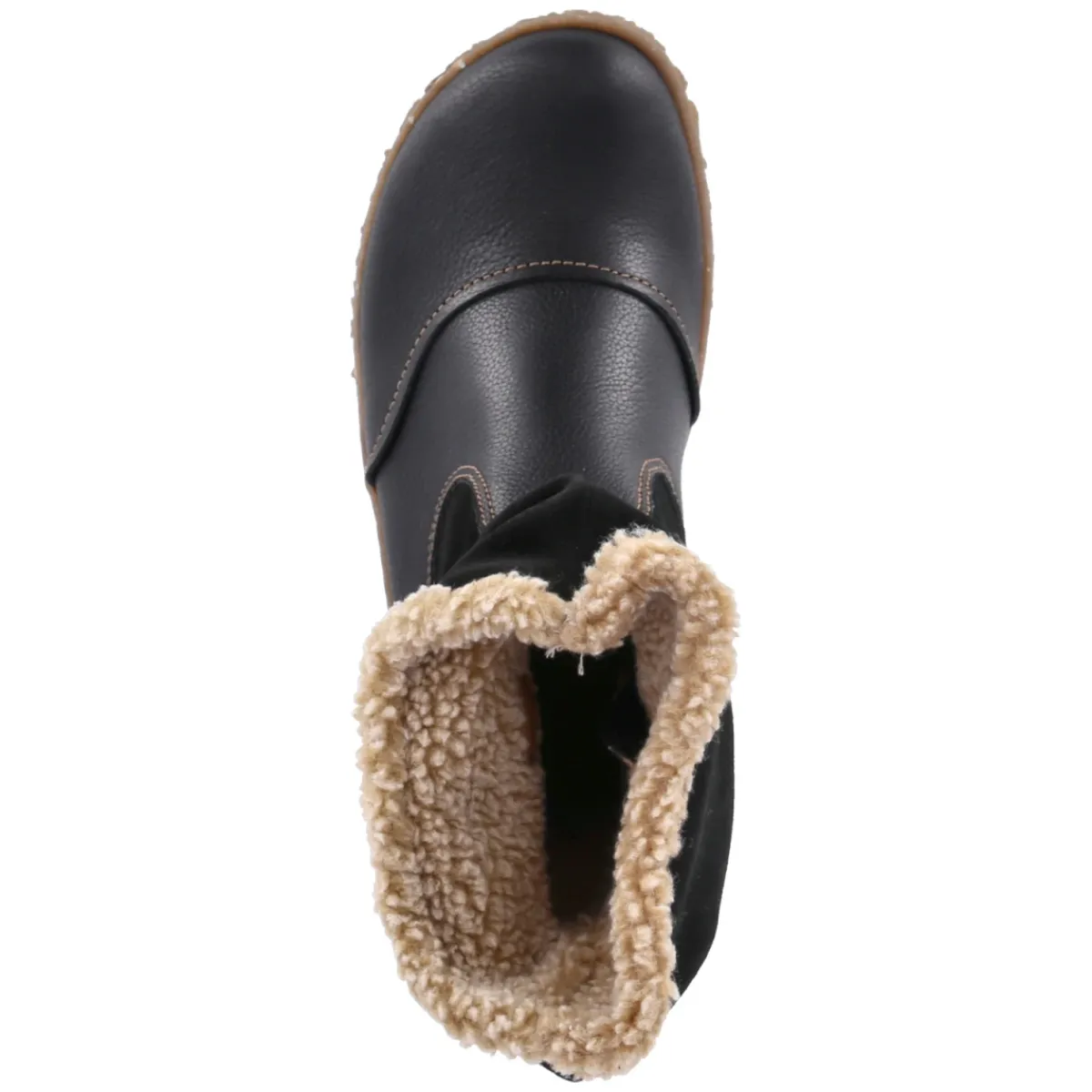 Die Stiefeletten NIDO von El Naturalista verbinden Robustheit und Wärme zu einem souveränen Begleiter an kalten Tagen. Langlebiges Echtleder formt die runde Silhouette, während ein weiches Teddyfutter samt Krempe für behagliches Klima sorgt. Der Reißverschluss am unteren Schaft erleichtert den Einstieg, die flexible, rutschfeste Laufsohle gibt Halt auf nassen Wegen. Verstärkte Fersen- und Zehenbereiche erhöhen die Strapazierfähigkeit im Alltag, die textile Decksohle ergänzt angenehme Trageeigenschaften. In klassischem Schwarz und mit normal ausfallender Passform lässt sich der Stil vielseitig kombinieren – ob casual oder elegant. Modetipp: Mit Strickkleid, blickdichter Strumpfhose und langem Wollmantel entsteht ein warmer, femininer Winterlook; ein Leder- oder Webgürtel in Ton-in-Ton akzentuiert die Krempe am Schaft harmonisch.