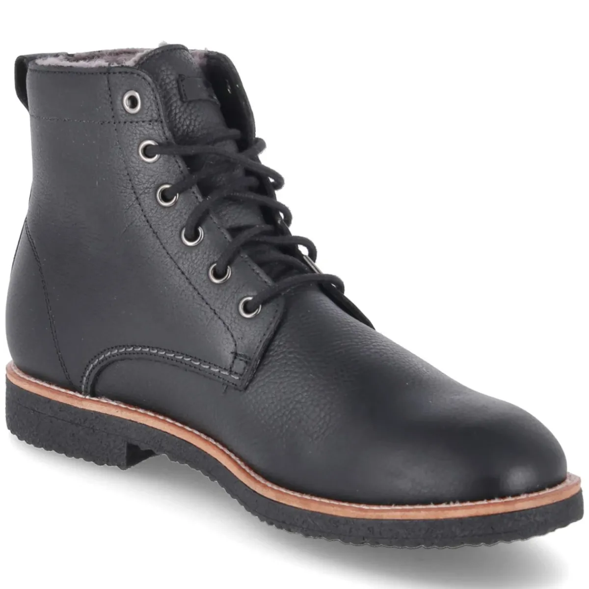Der Winterboot GLASGOW IGLOO C3 von Panama Jack verbindet robuste Funktion mit schlichter Urbanität. Schwarzes, wasserfestes Leder schützt zuverlässig vor Schnee und Tauwetter, das weiche Lammfellfutter sorgt für behagliche Wärme vom Knöchel bis zur Zehenspitze. Die runde Vorderpartie und die klassische Schnürung bieten angenehmen Halt, der 3 cm hohe Blockabsatz und die flexible, rutschfeste Gummisohle geben Stabilität auf glatten Wegen. Eine verstärkte Ferse, Anziehlasche und das dezente Label unterstreichen die hochwertige Verarbeitung. Die hellbraune Zwischensohle setzt einen feinen Kontrast zum Obermaterial. Mit normal ausfallender Passform und lederner Decksohle entsteht ein komfortables Tragegefühl im Alltag und auf Wintertouren. Modetipp: In Kombination mit dunkler Raw Denim, Grobstrickpullover und Wollmantel entsteht ein zeitloser Look zwischen Outdoor und City.