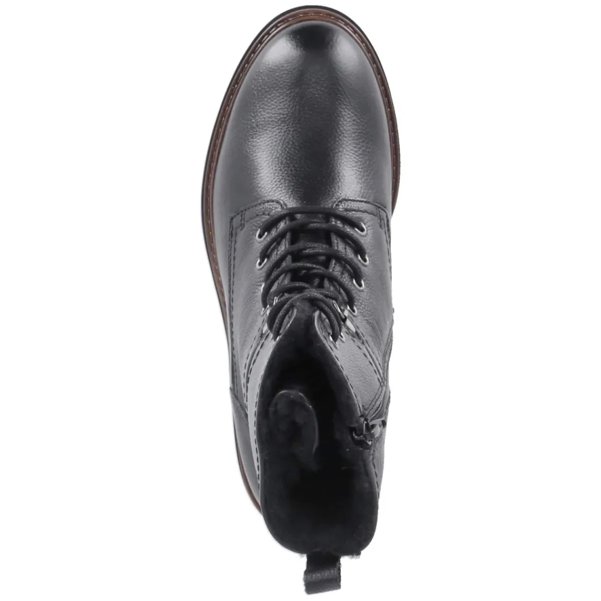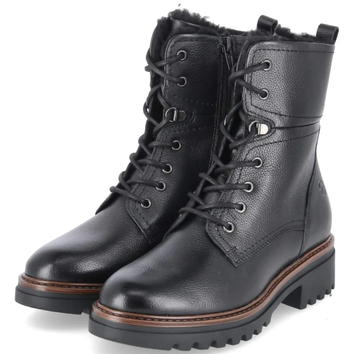 Die Winterschnürstiefeletten von Tamaris verbinden urbanen Look mit funktionalem Komfort. Schwarzes Glattleder in robuster Qualität und eine verstärkte Ferse sorgen für langlebige Formstabilität, während warmes Futter und eine textile Decksohle behagliche Wärme bieten. Der rund gestaltete Leisten gewährt Zehenfreiheit, das gepolsterte Fußbett entlastet bei langen Wegen. Dank Schnürsenkeln lässt sich die Passform präzise justieren, der seitliche Reißverschluss ermöglicht einen bequemen Einstieg. Ein 4,5 cm hoher Blockabsatz verleiht subtilen Lift und sicheren Stand; die flexible, rutschfeste Profilsohle greift zuverlässig auf winterlichen Untergründen. Mit Schafthöhe ca. 16 cm und Umfang ca. 24 cm überzeugt das Damenmodell als verlässlicher Alltagsbegleiter und fällt größengetreu aus. Modetipp: Zu Wollmantel, Strickkleid und blickdichter Strumpfhose entsteht ein eleganter Winterlook.